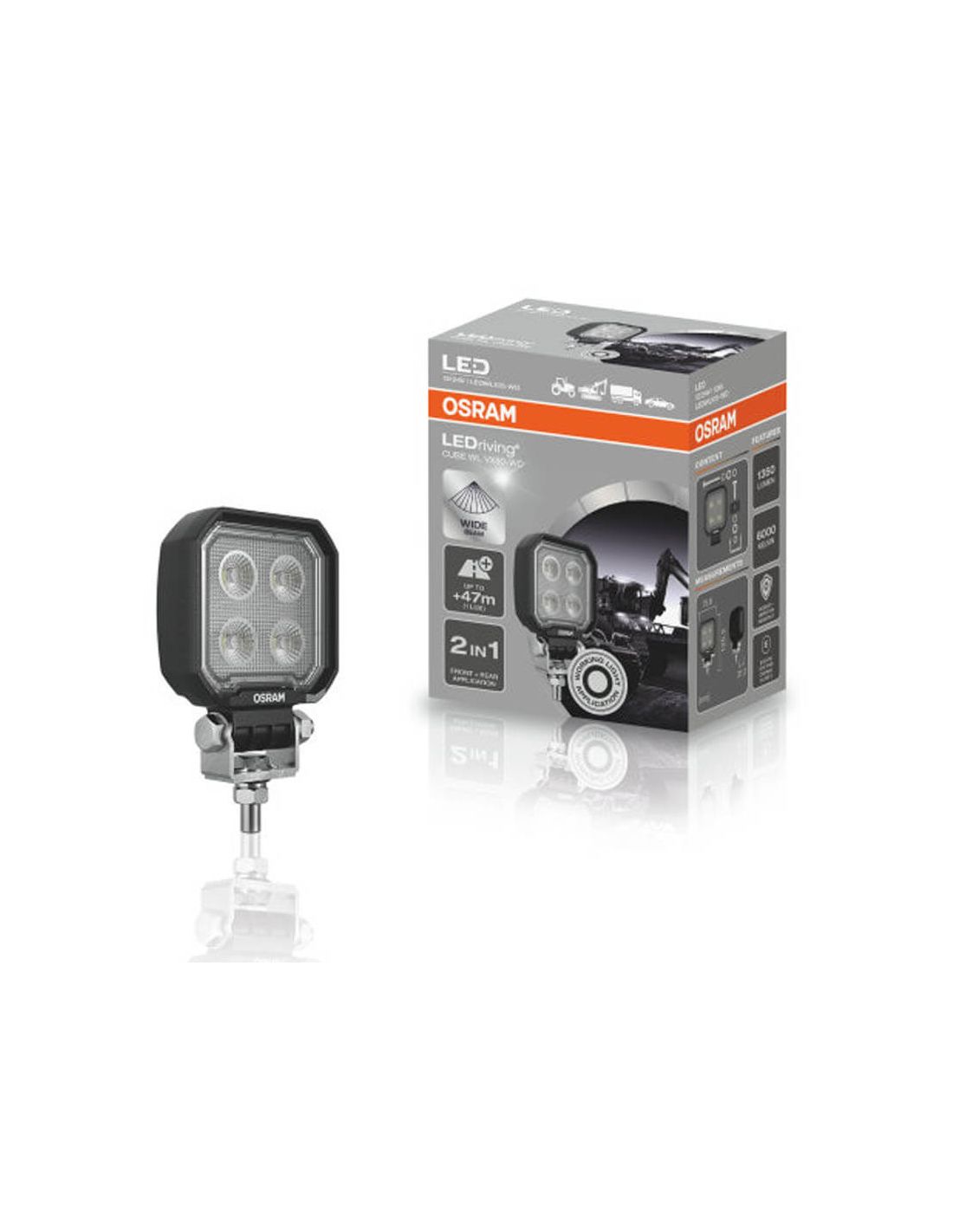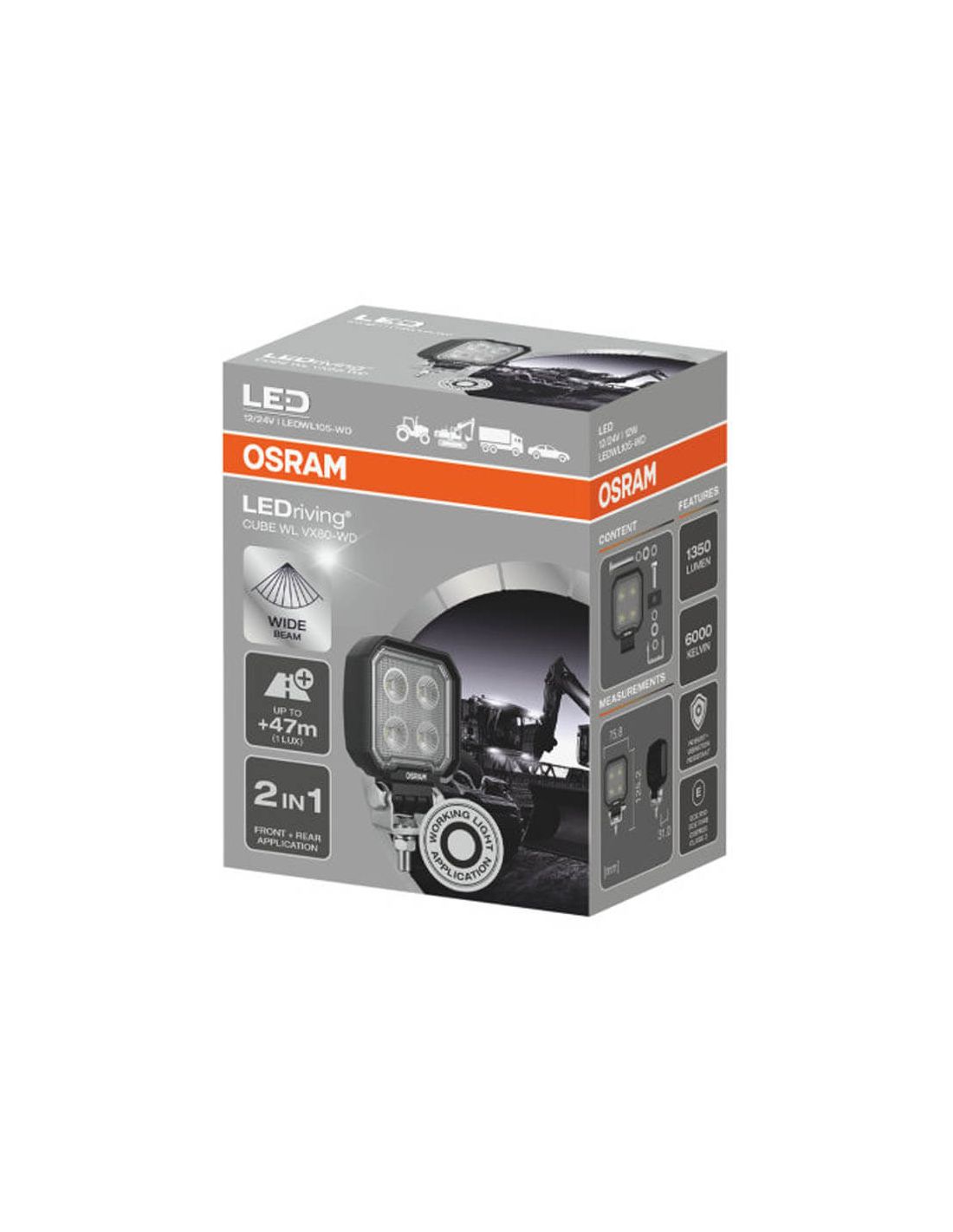 Faro LED cuadrado con óptica de trabajo ´Wide Beam` una potencia de 12W, una intensidad de luz máxima de 1.350Lm y un tono de luz blanco de 6000K, el nuevo Faro LED Cube VX80-WD Osram cumple con todos los estándares para este tipo de producto, su óptica de luz es de campo ancho ofreciendo un alcance de haz de luz de mas de 43 metros de alcance. Este Faro LED Osram Cube VX80-WD LEDWL104-WD se pueden instalar tanto en 12 Voltios como en 24 Voltios e incluye todo lo necesario para se instalado.
