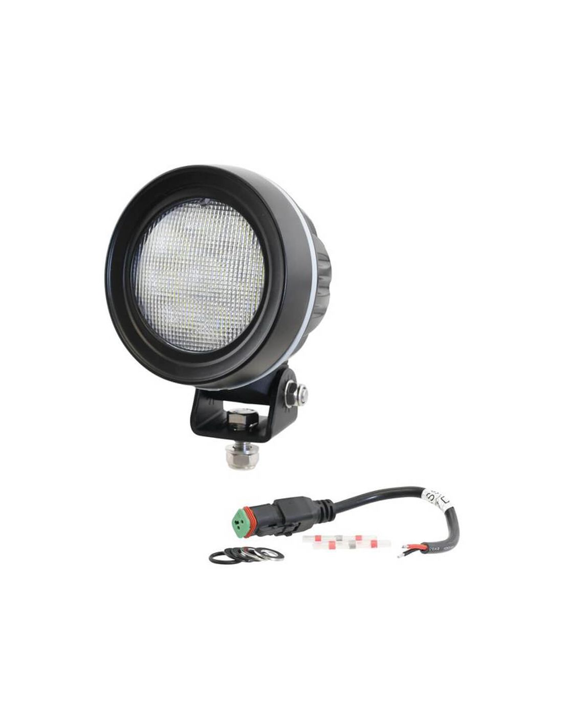 Fabricado con carcasa de aluminio y lente de plástico de seguridad, incluye soporte de montaje tipo bracket y conexión mediante conector DT, lo que facilita una instalación rápida y segura.