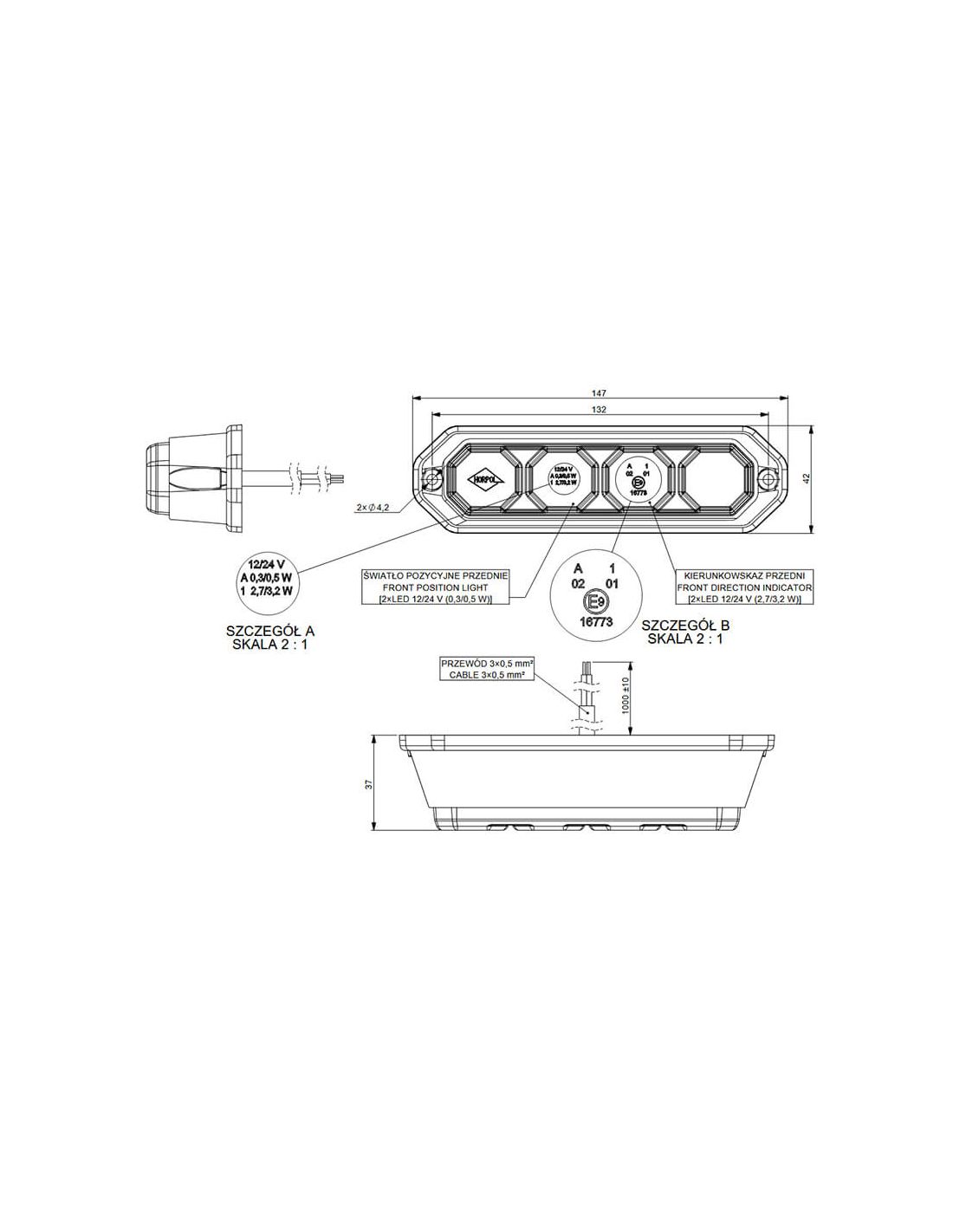 Faro delantero LED tipo barra LZD 2265, 2 funciones (posición e intermitente), 4 LEDs, tulipa transparente, homologación A1 y R10, estanco IP68, 12/24V. Compacto, universal, resistente y listo para vehículos agrícolas, remolques y maquinaria.