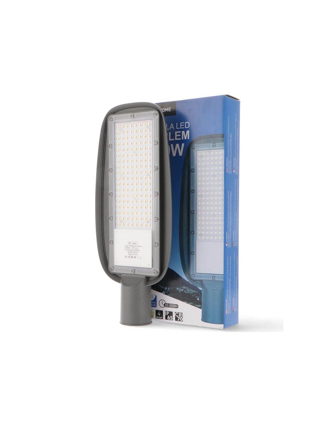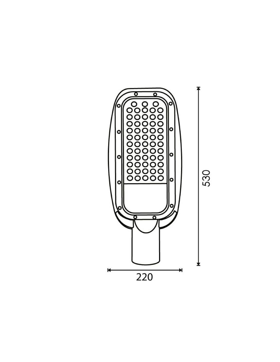 Farola LED de 100W para alumbrado público exterior. 11000 lm, IP65, IK08, ángulo 140°x65°, vida útil de 30,000 horas, eficiencia de 110 lm/W. Alta durabilidad y rendimiento.