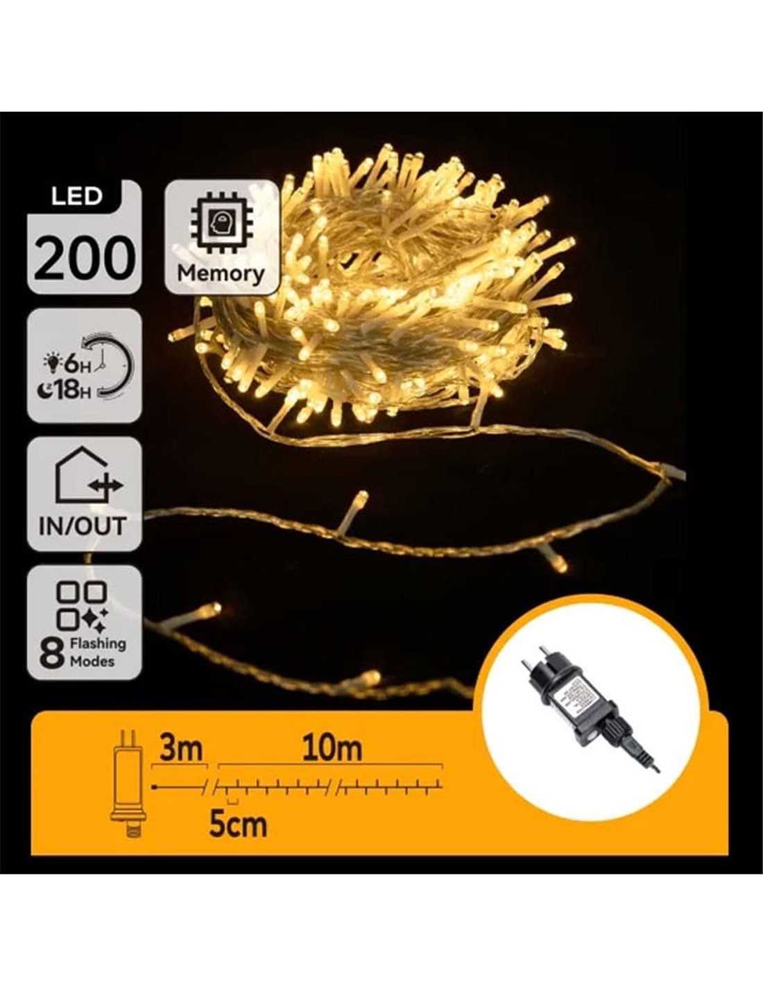 Se trata de una guirnalda de luces planas de bajo voltaje, diseñada para funcionar con un adaptador 220–240 V~ que alimenta la cadena con la máxima seguridad. Con solo 3,6 W de potencia máxima, esta guirnalda LED se puede mantener encendida durante horas con un consumo mínimo. Además, integra 8 modos de iluminación con memoria y temporizador, de forma que recuerda el último programa utilizado y permite configurar ciclos automáticos de encendido y apagado cada día. Su grado de protección IP44 la hace apta para interior y exterior, resistiendo la humedad y las bajas temperaturas típicas de la temporada navideña.