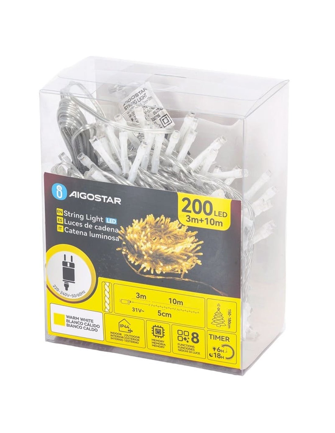 Si buscas una guirnalda LED de bajo voltaje de 10 m y 200 LED blanco cálido con IP44, 8 modos, memoria y temporizador, este modelo de Aigostar es una opción perfecta para iluminar tus espacios con una luz cálida, segura y de muy bajo consumo. Consíguela en LeonLeds.com y prepara una decoración navideña con acabado profesional.