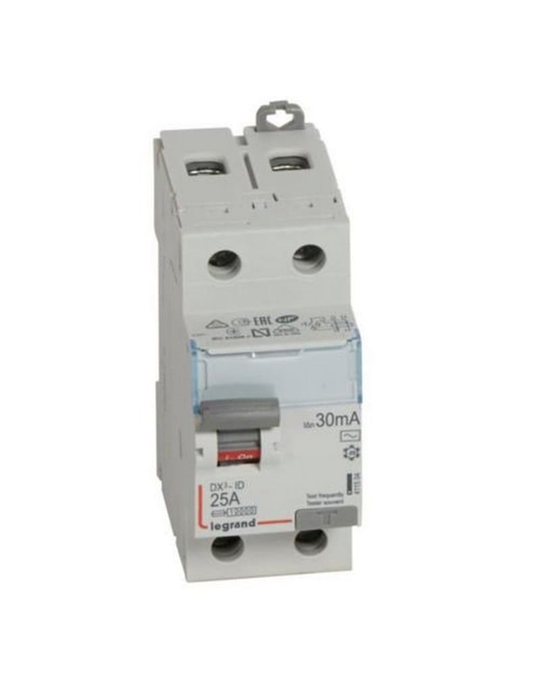 Interruptor diferencial Legrand DX³-ID 411504E — 2P, 25 A, 30 mA tipo AC para 230 V AC. Diseñado para proteger a las personas frente a contactos indirectos y fugas a tierra. Montaje en carril DIN (2 módulos), bornes IP20, IK04, e inmunidad mejorada a disparos en entornos perturbados. Compatible con auxiliares DX³ y motorización.