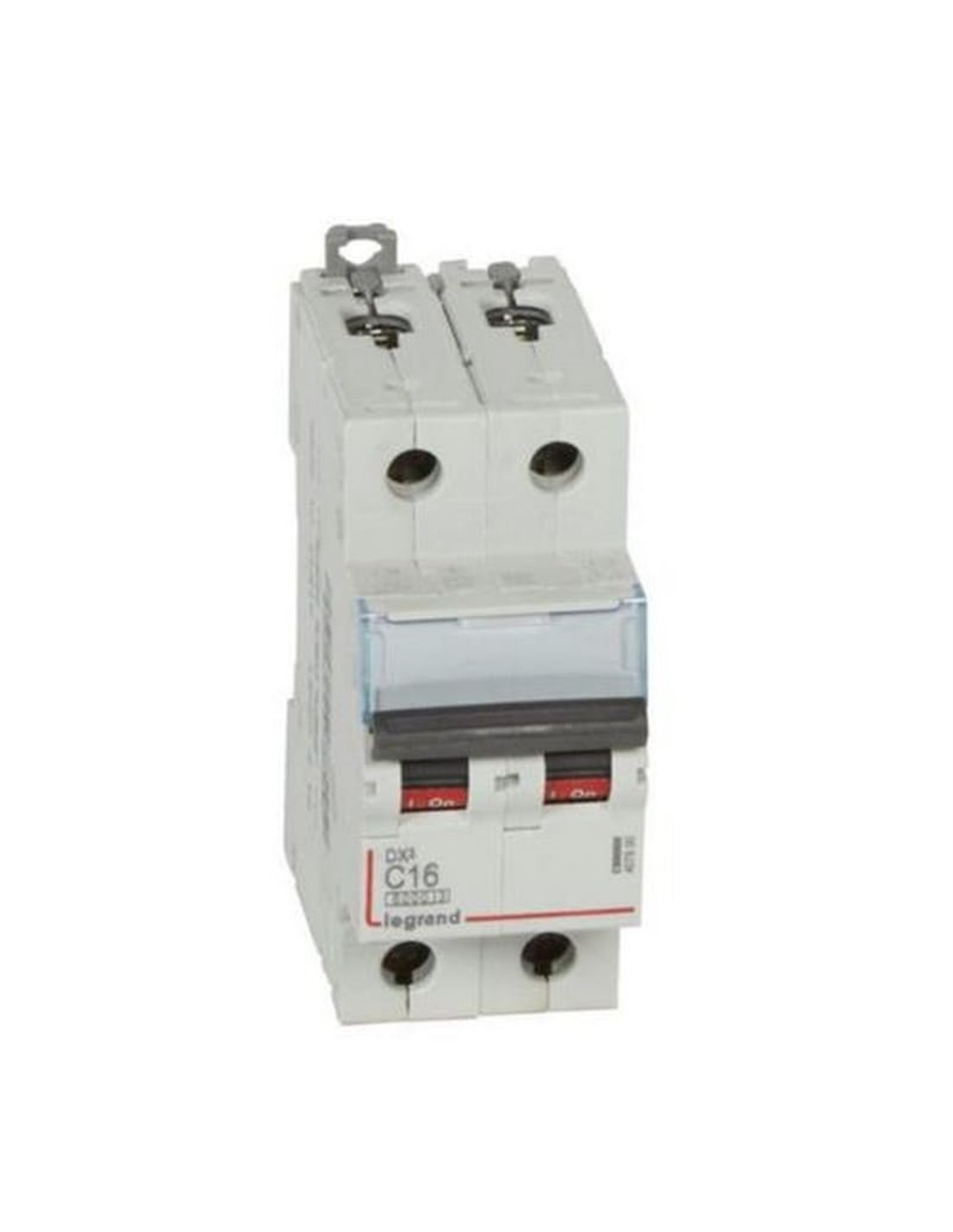 Magnetotérmico DX³ Legrand 2P 16A con curva C y poder de corte 6 kA, ideal para proteger circuitos en viviendas y comercios. Ofrece IP20 (fingerproof), alta selectividad y limitación de energía clase 3 según IEC 60898-1. Compatible con peines HX³, peines de horquilla y púa, y con auxiliares DX³ y bloques diferenciales. Tensión 230/400 V~, 2 módulos, indicación ON/OFF visible y portaetiquetas para identificar el circuito.