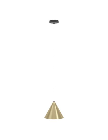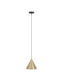 Lámpara colgante Eglo NARICES de 1 luz con pantalla cónica en latón cepillado con interior dorado suspendida de un cable textil negro desde un dosel metálico del mismo color. Diseño New Nordic elegante, ideal para salón o comedor. Funciona con bombillas E27 (no incluidas).