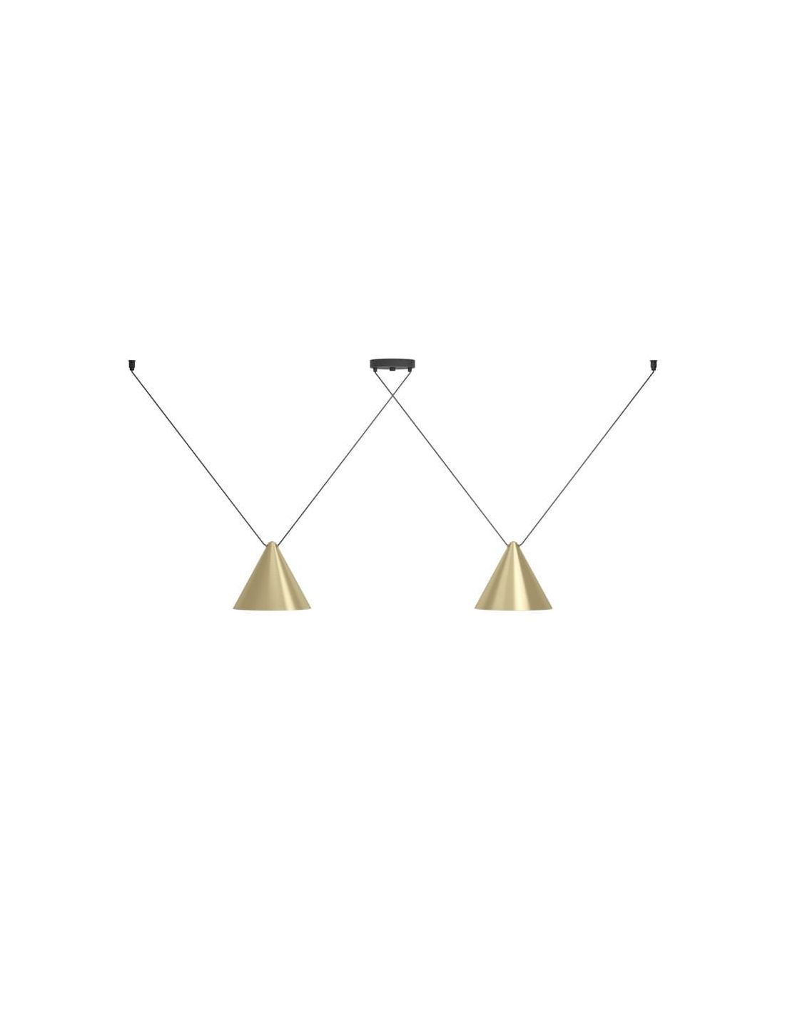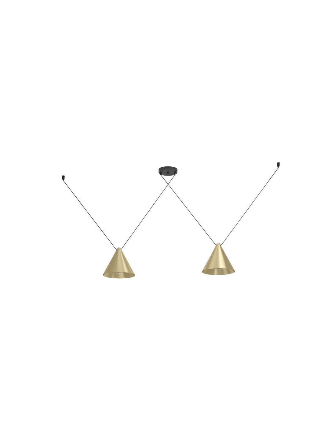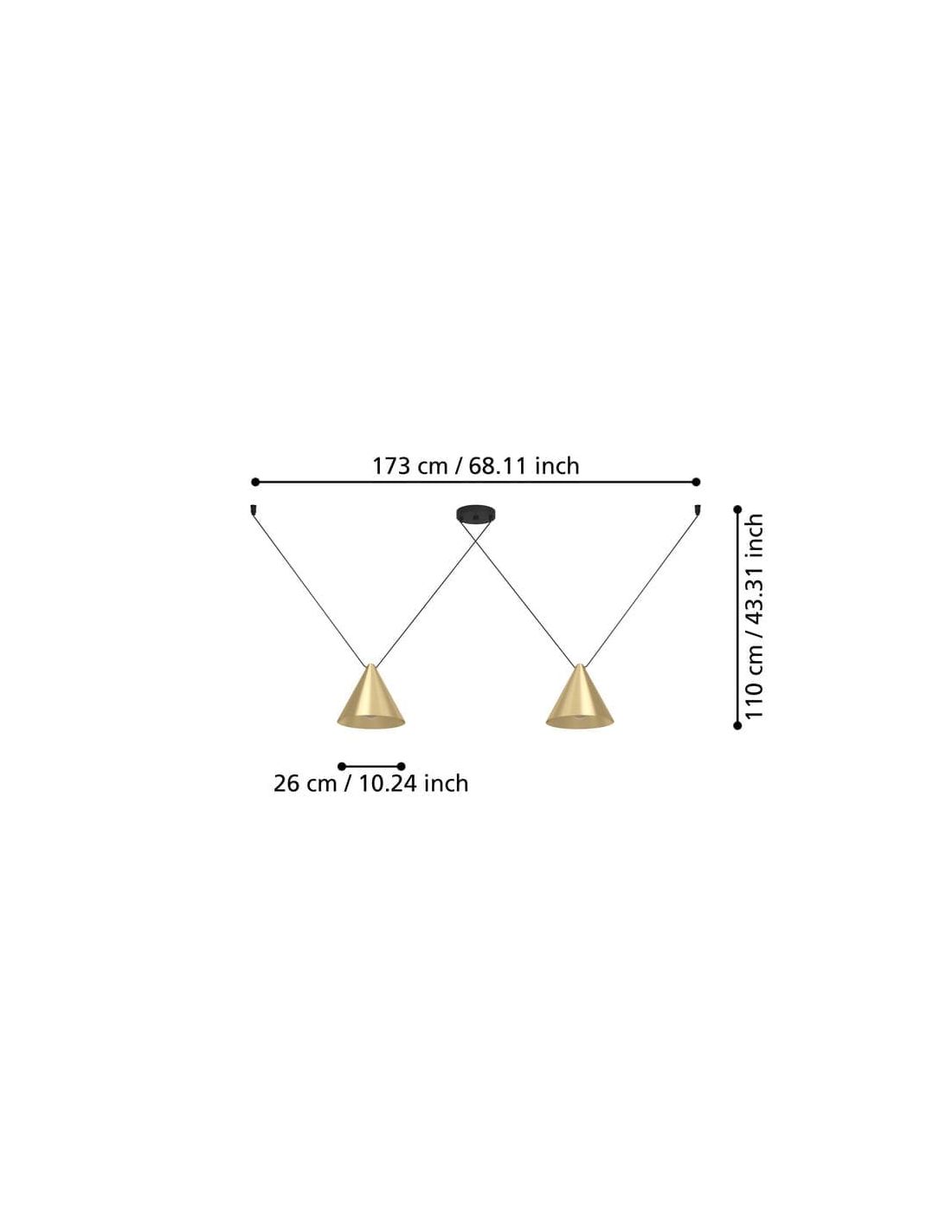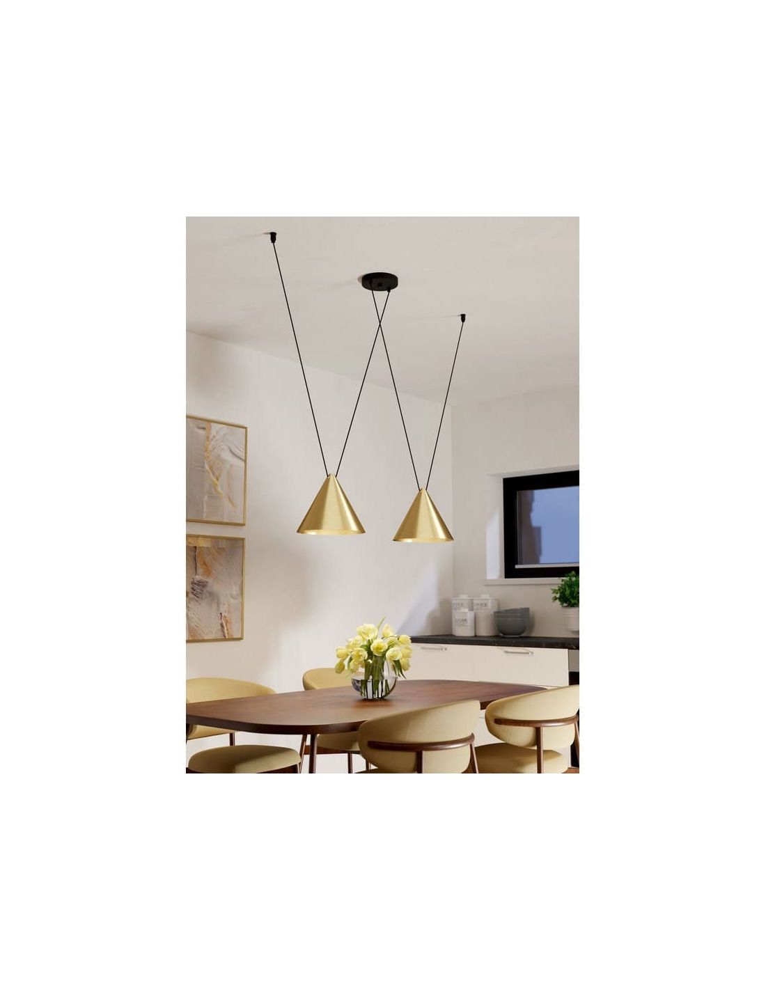 Lámpara de techo Eglo NARICES-1 de 2 luces con dos pantallas cónicas en latón cepillado con interior dorado y estructura en negro. Diseño retro y elegante, ideal para sala de estar o comedor. Compatible con bombillas E27 (no incluidas).