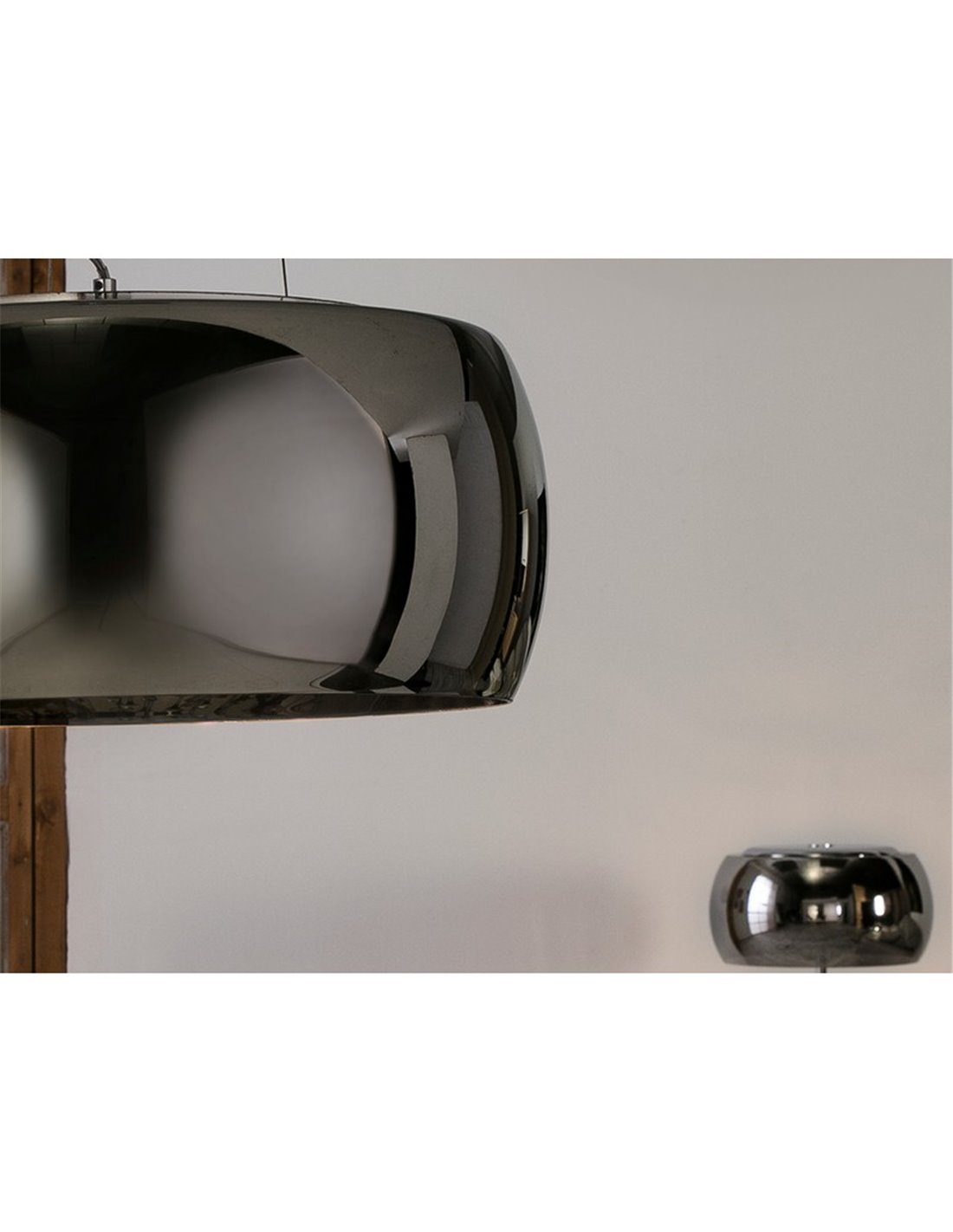 Su diámetro de 50 cm y su altura regulable entre 40 y 140 cm hacen que se adapte a mesas de comedor, zonas de estar y espacios amplios. El cristal espejado añade profundidad visual incluso cuando la lámpara está apagada.