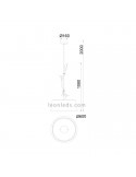 La Lámpara tiene una pantalla de 60CM de diámetro, además se puede regular en altura desde los 108CM hasta los 2 Metros, la base del techo tiene 16CM de diámetro.