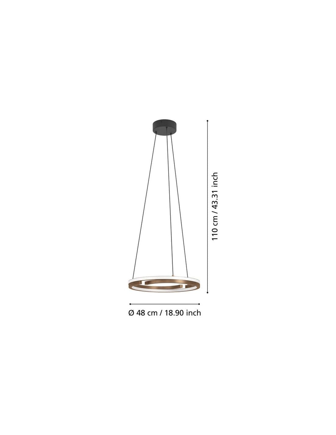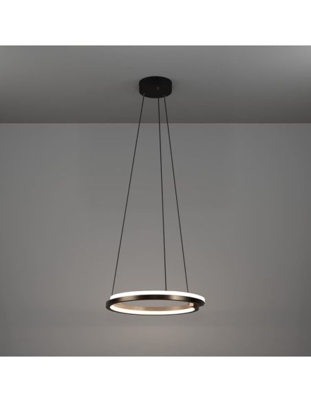 La lámpara colgante LED Eglo MEZZOMONTE 901826 destaca por su diseño contemporáneo en forma de anillo abierto, con una elegante combinación de aluminio en acabado negro y bronce. Su estructura ligera y flotante crea un punto focal sofisticado sobre mesas de comedor o en espacios abiertos del hogar.