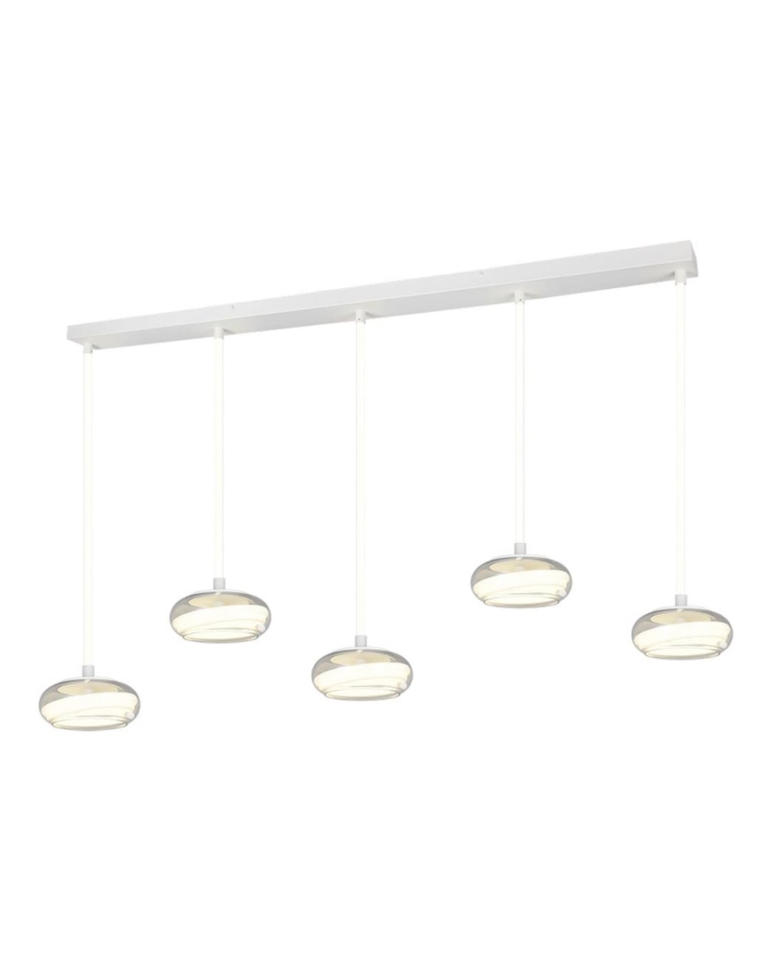 La lámpara colgante LED TARSIA destaca por su diseño lineal y elegante, ideal para iluminar mesas de comedor, islas de cocina o espacios amplios. Su acabado en blanco y su estructura estilizada de 162 cm de longitud aportan una estética moderna y ligera que se integra fácilmente en ambientes contemporáneos.