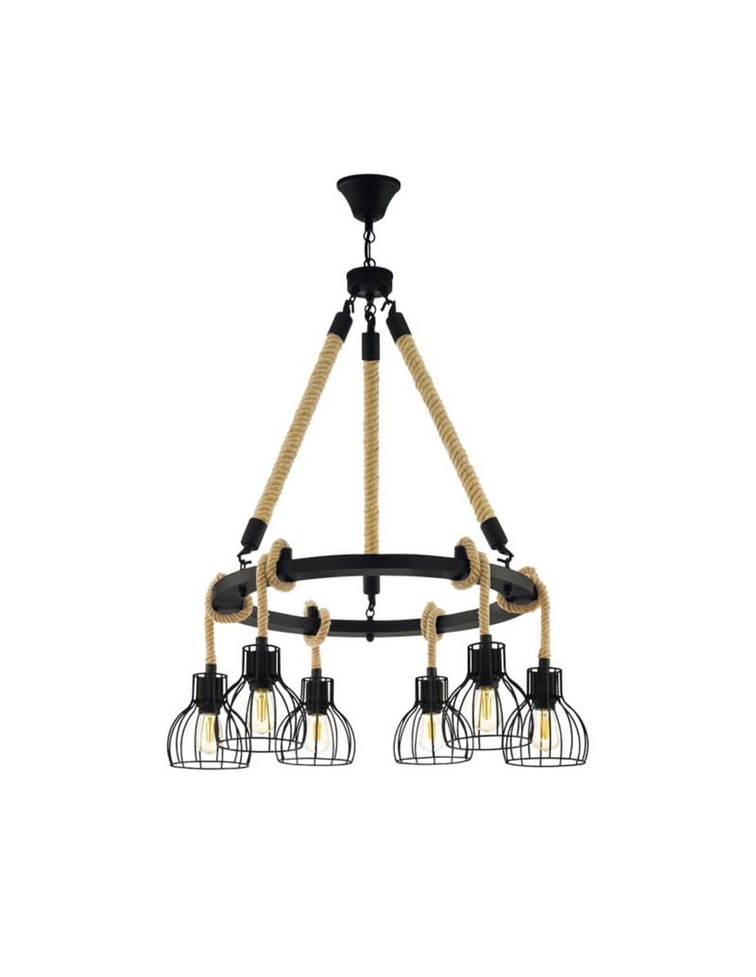 Lámpara colgante RAMPSIDE de Eglo, con anillo de metal negro y seis pantallas de alambre suspendidas de cuerdas de cáñamo. Compatible con bombillas E27 (no incluidas). Perfecta para iluminar salones o comedores con un estilo vintage.