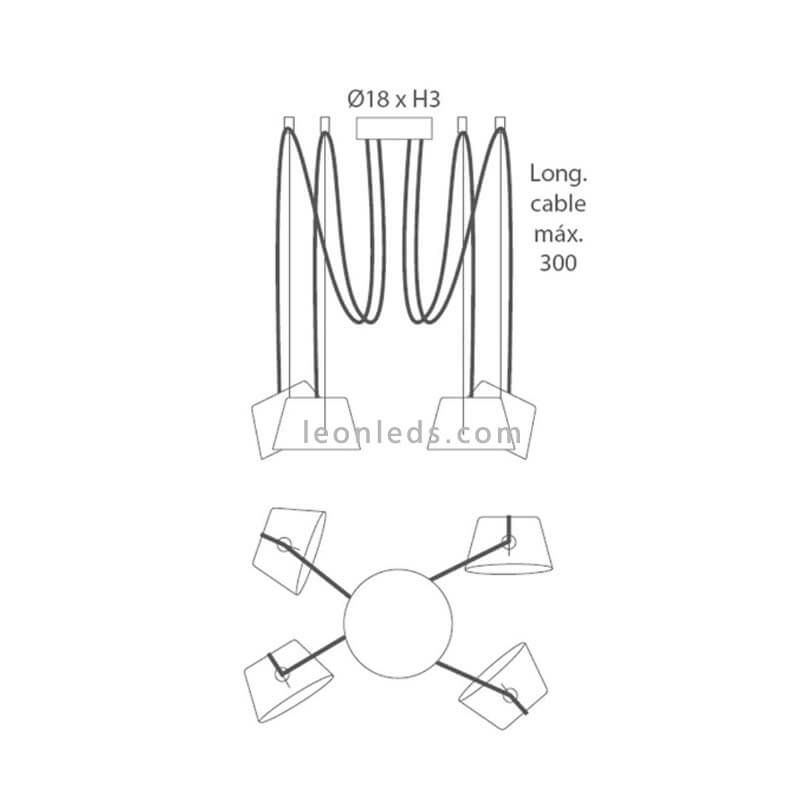 La altura de cada pantalla de esta Lámpara es de 3 metros, con lo que puede colocar a cada una de ellas a la altura deseada con un máximo de 3 metros de altura y permite orientada de forma independiente cada una de ellas para iluminar la zona deseada y decorar la estancia como nosotros queramos. Es una Lámpara muy versátil que nos permite iluminar la estancia y decorarla de la forma que deseemos dentro de las posibilidades que nos ofrece esta Lámpara colgante Sento Blanca. Es muy recomendable instalar esta Lámpara en estancias de grandes dimensiones o para iluminar zonas concretas que con el tiempo se puedan mover como puede ser una tienda o local comercial, el resultado de esta Lámpara Colgante instalada es espectacular.