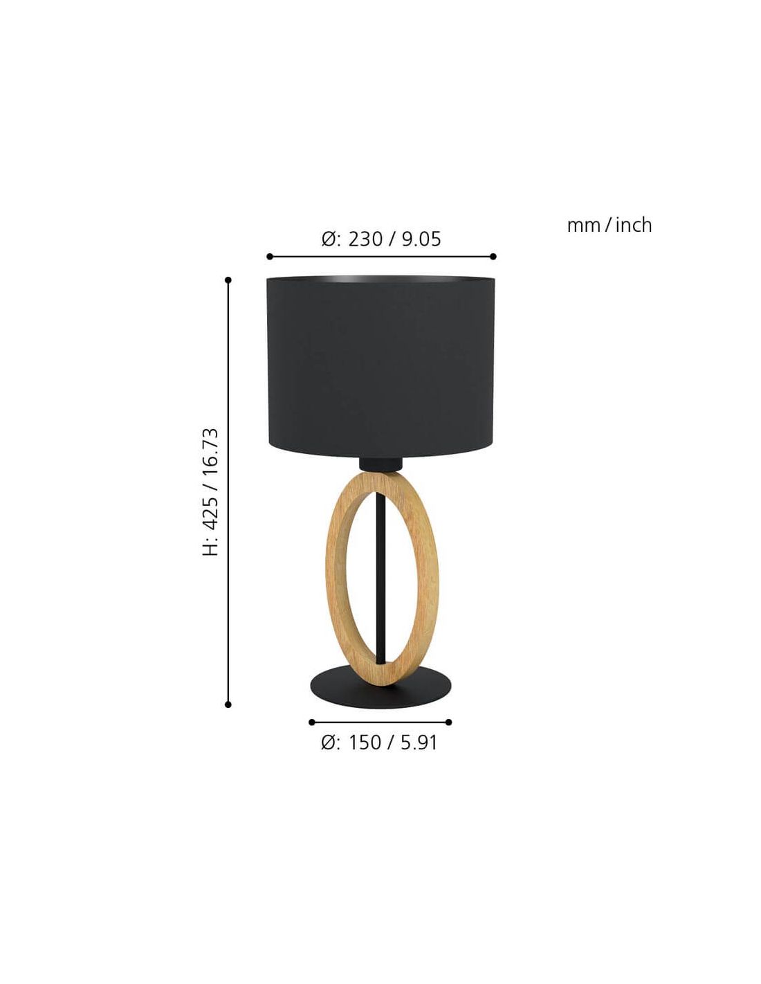 La pantalla textil negra no solo complementa el diseño contemporáneo de la lámpara, sino que también proporciona una iluminación suave y acogedora, ideal para cualquier habitación. Su tamaño compacto (H: 425 mm | Ø 230 mm) la hace perfecta para mesitas de noche, salones, comedores o pasillos.
