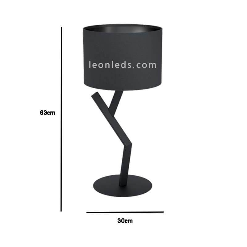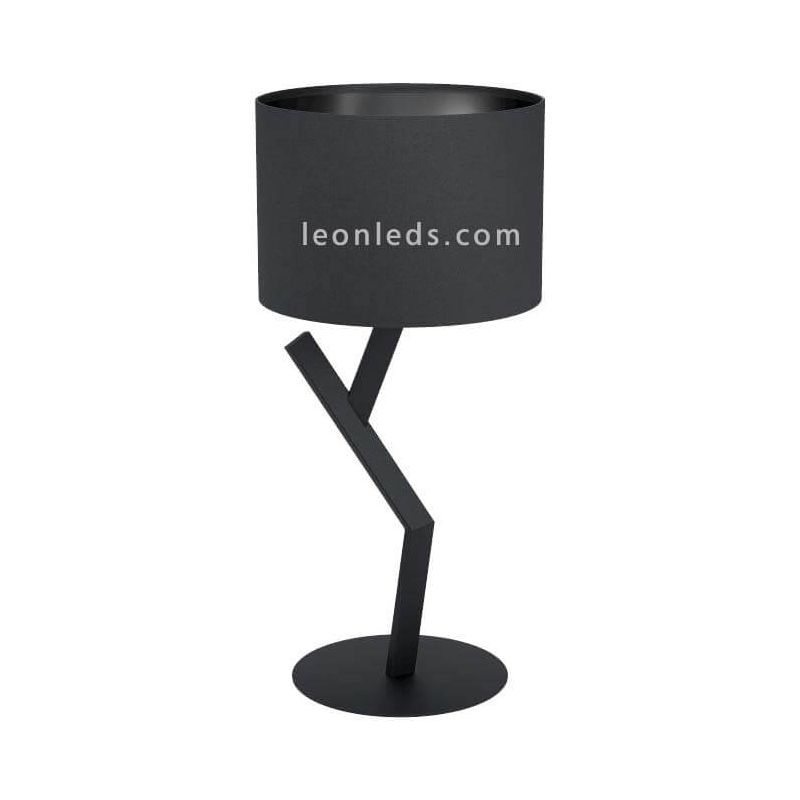 Lámpara de mesa moderna Balnario negra 1xE27 de Eglo Iluminación. Está fabricada con un cuerpo de acero de color negro mate con formas triangular que simulan la estructura de un árbol minimalista junto con una pantalla textil circular de color negro mate.