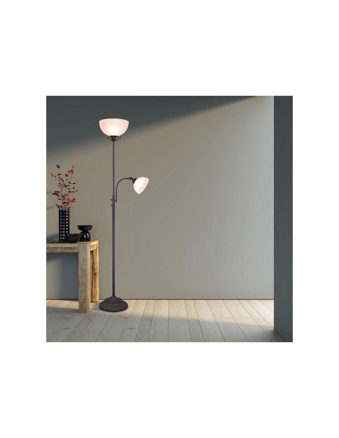 La lámpara de pie Country, con dos luces, dispone de un diseño que combina lo clásico y moderno, así como la elegancia y la tranquilidad. Está llena de conceptos inspiradores que parten de un cuerpo color óxido de metal y cristal.