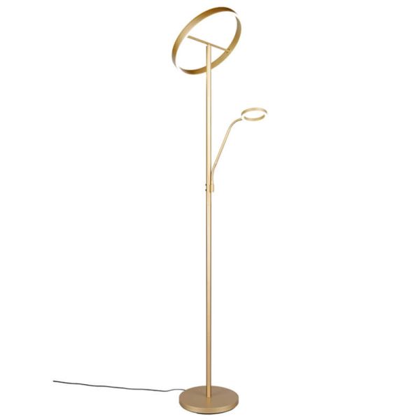 Lámpara de pie LED WILLIS en color oro con diseño moderno y funcionalidad avanzada. Cuenta con cabezal de luz regulable, brazo de lectura flexible, control de brillo y color de luz. Ahorra hasta un 80% de energía con su tecnología LED. Ideal para cualquier estilo de decoración. En su luz superior su potencia de luz es de 39W y 4.600Lm, en la luz del brazo flexible su potencia es de 5,5W y su intensidad de luz es de 550Lm, en ambas el tono de luz es regulable, 2700K + 3200K + 4000k.
