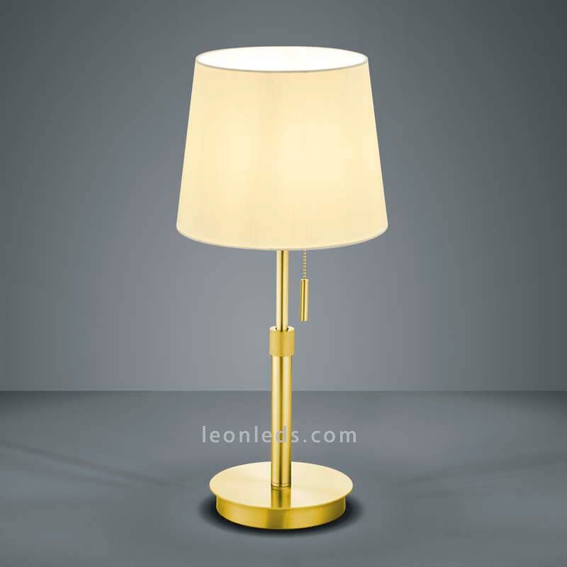 Lámpara de Sobremesa de estilo clásico de la serie Lyon con una pantalla textil de color blanco y una estructura metálica de color Bronce mate, necesita 1 Bombillas LED con rosca E27 y se acciona mediante un interruptor de cuerda de fácil acceso. Incluye cable ajustable desde 150Cm hasta 161Cm.