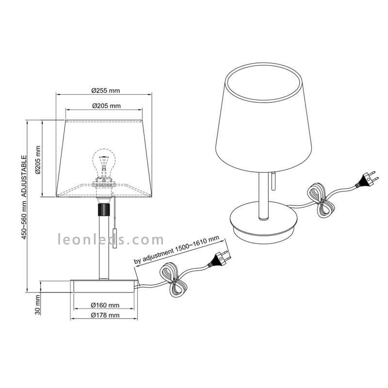 Esta Lámpara de mesa de noche ofrece un diseño moderno y la altura de esta Lámpara es regulable desde de 45Cm hasta 56Cm, la pantalla tiene una longitud de 20,5Cm y una anchura de 20,5Cm. Su base redonda tiene un diámetro de 17,8Cm.