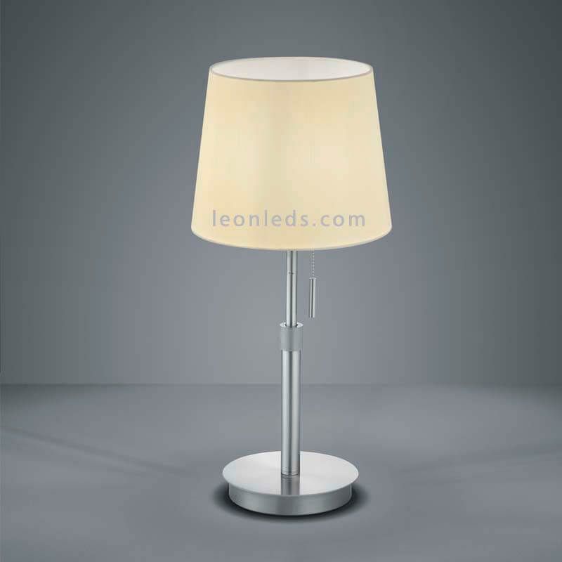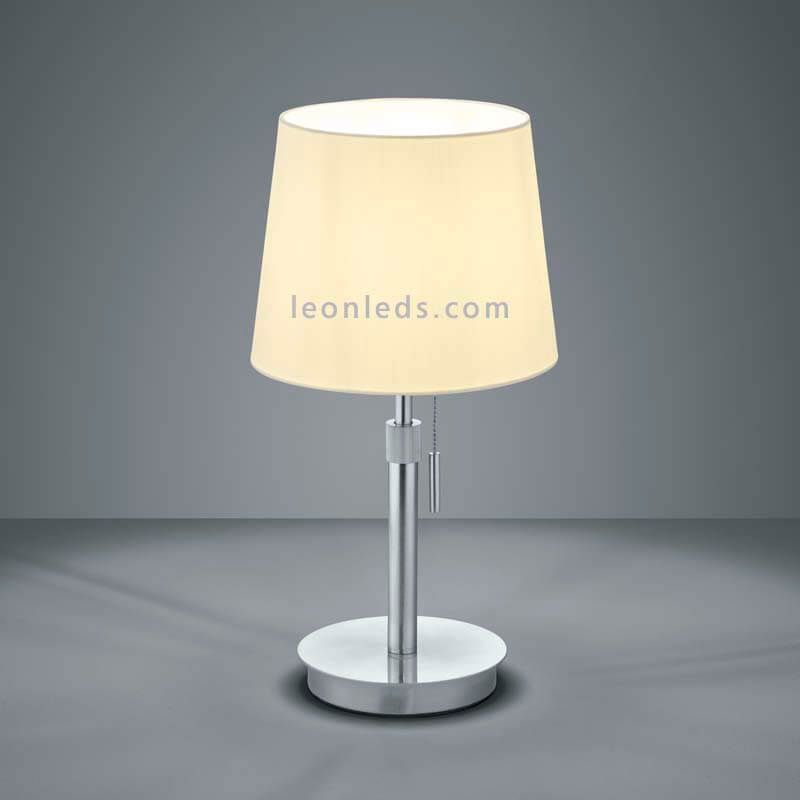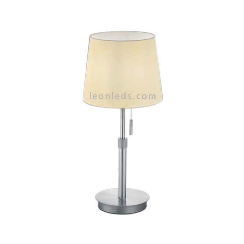 Lámpara de Sobremesa de la serie Lyon con una estructura de color níquel mate y una pantalla textil de color blanco. Incluye cable ajustable desde 1,5 metros hasta 161Cm, el interruptor de encendido y apagado lo encontramos en forma de cuerda, con un fácil accionamiento. Para iluminar necesita una Bombilla LED con rosca E27, nosotros recomendamos instalar una Bombilla en formato esférica con una potencia de entre 4 y 7W y una tonalidad de 3000K o 4000K.