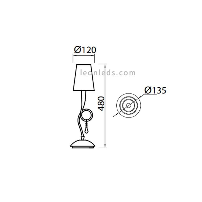 Esta Lámpara de mesa clásica tiene una altura de 48Cm y un diámetro de base de 13,5Cm. Estas medidas se pueden ver en una de las fotos.