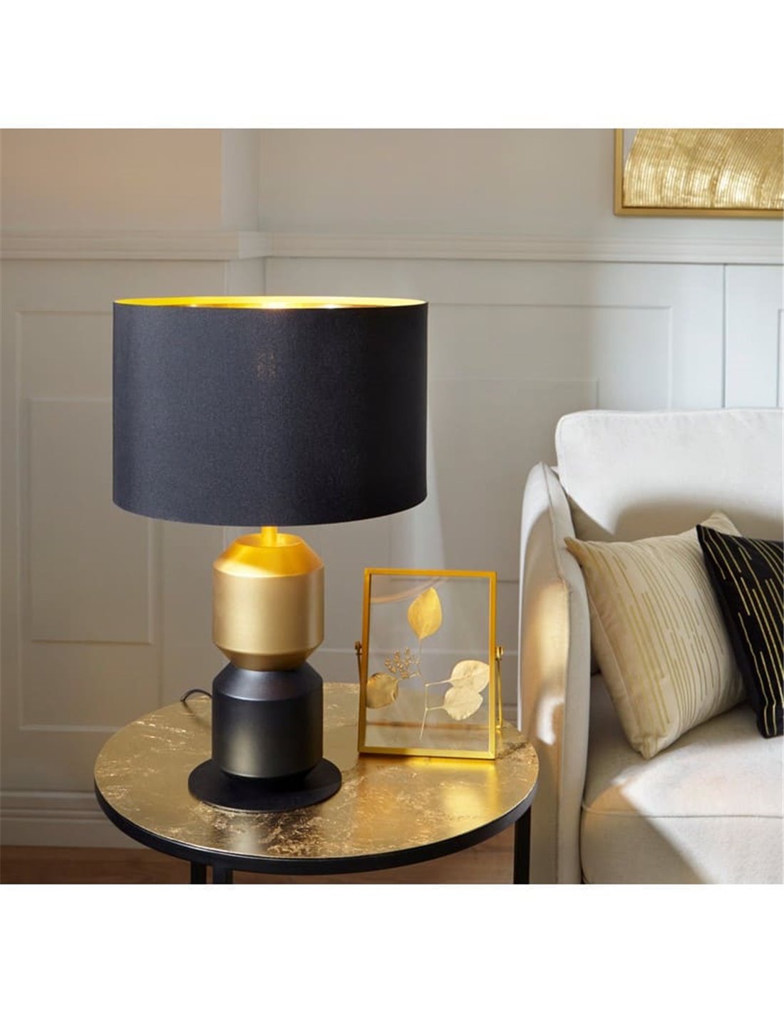 La lámpara de sobremesa LAURIGNANO combina un elegante diseño en color negro con detalles dorados y una pantalla textil negra. Funciona con bombilla E27 y es ideal como luz decorativa en salones, dormitorios o mesas auxiliares.