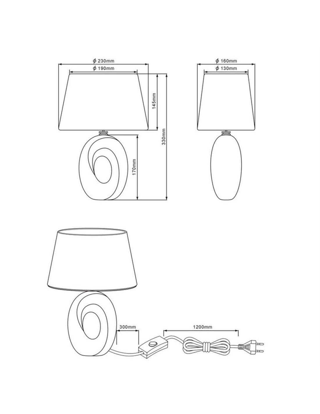 Esta Lámpara de mesa de noche ofrece un diseño moderno y la altura de esta Lámpara es de 33Cm, la pantalla tiene una longitud de 23Cm y una anchura de 16Cm. Su base tiene una altura de 17Cm.