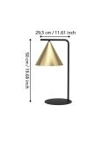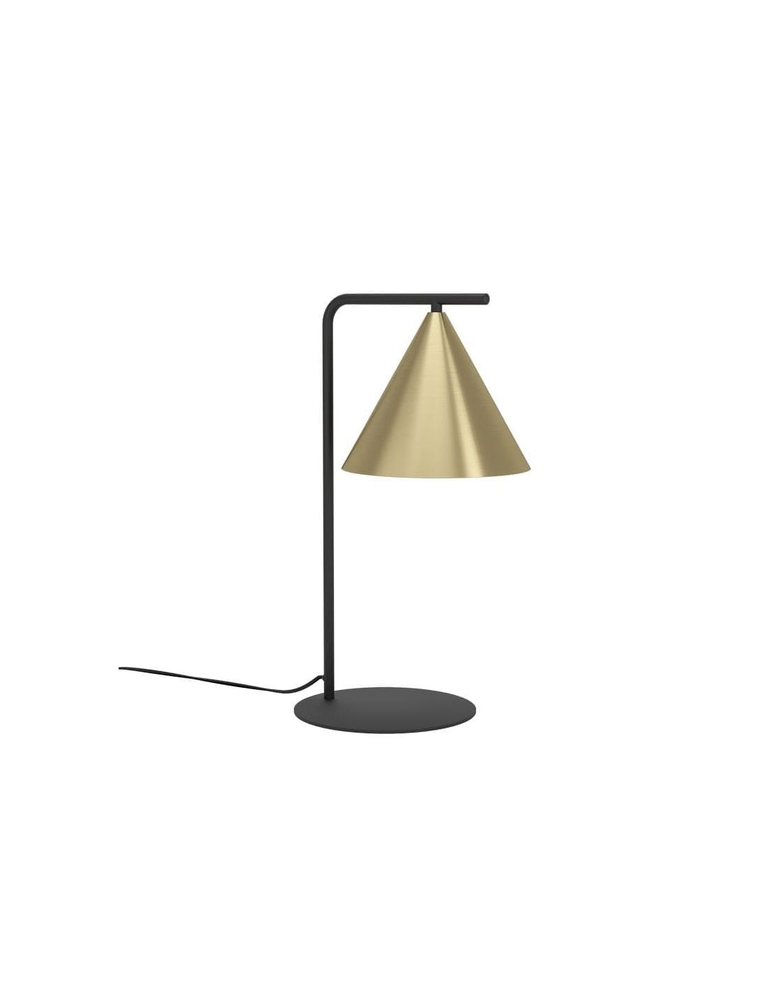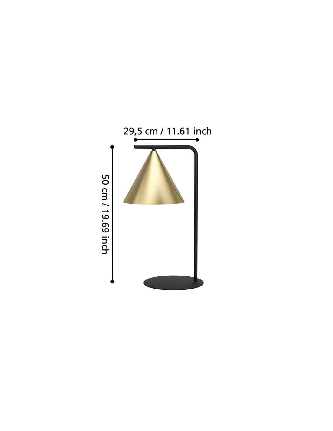 Lámpara de sobremesa Eglo NARICES con base curvada de metal negro y pantalla cónica en latón cepillado con interior dorado, diseño New Nordic elegante y versátil. Ideal para dormitorio, salón, comedor o pasillo. Compatible con bombillas E27 (no incluidas).