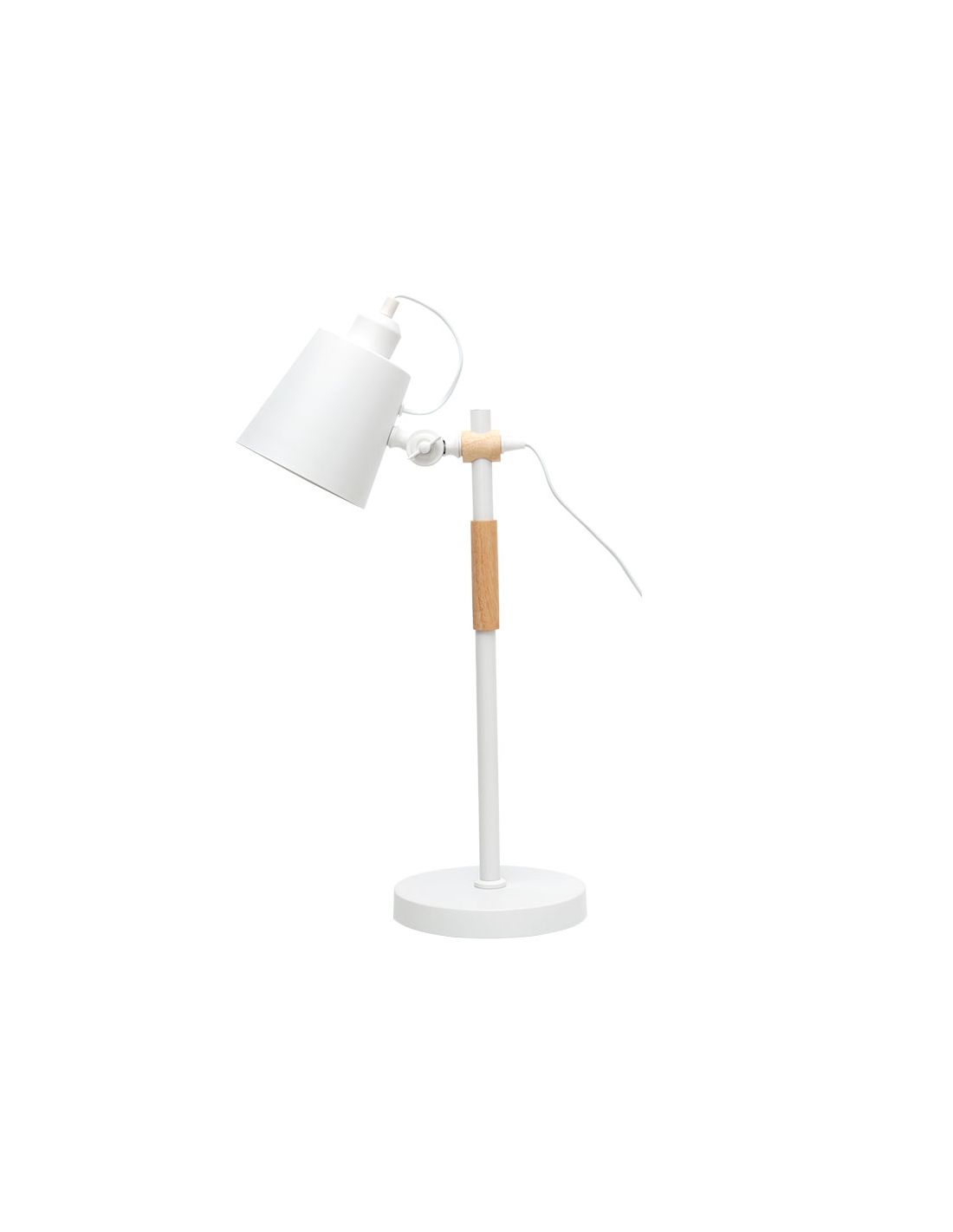 Flexo para mesa de estilo nórdico de color blanco y madera con una pantalla de color blanco roto para alojar en su interior una bombilla LED con rosca E27.