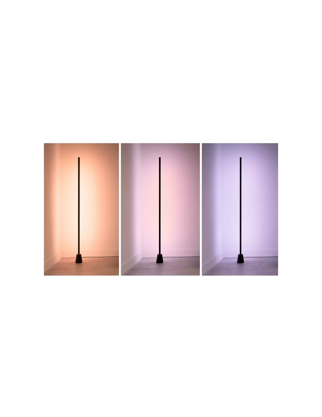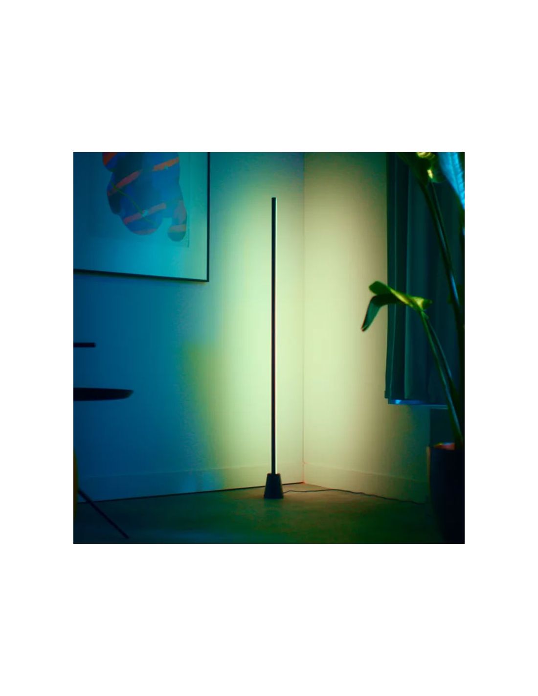La lámpara de suelo LED WiZ Gradient Floor Light negra está diseñada para transformar tu salón, dormitorio o zona gaming en un espacio envolvente y lleno de color. Su diseño fino y minimalista de 1,4 metros de altura, con carcasa de aluminio negro, se apoya discretamente en la pared y proyecta un efecto degradado multicolor que viste la habitación de luz ambiente sin deslumbrar.