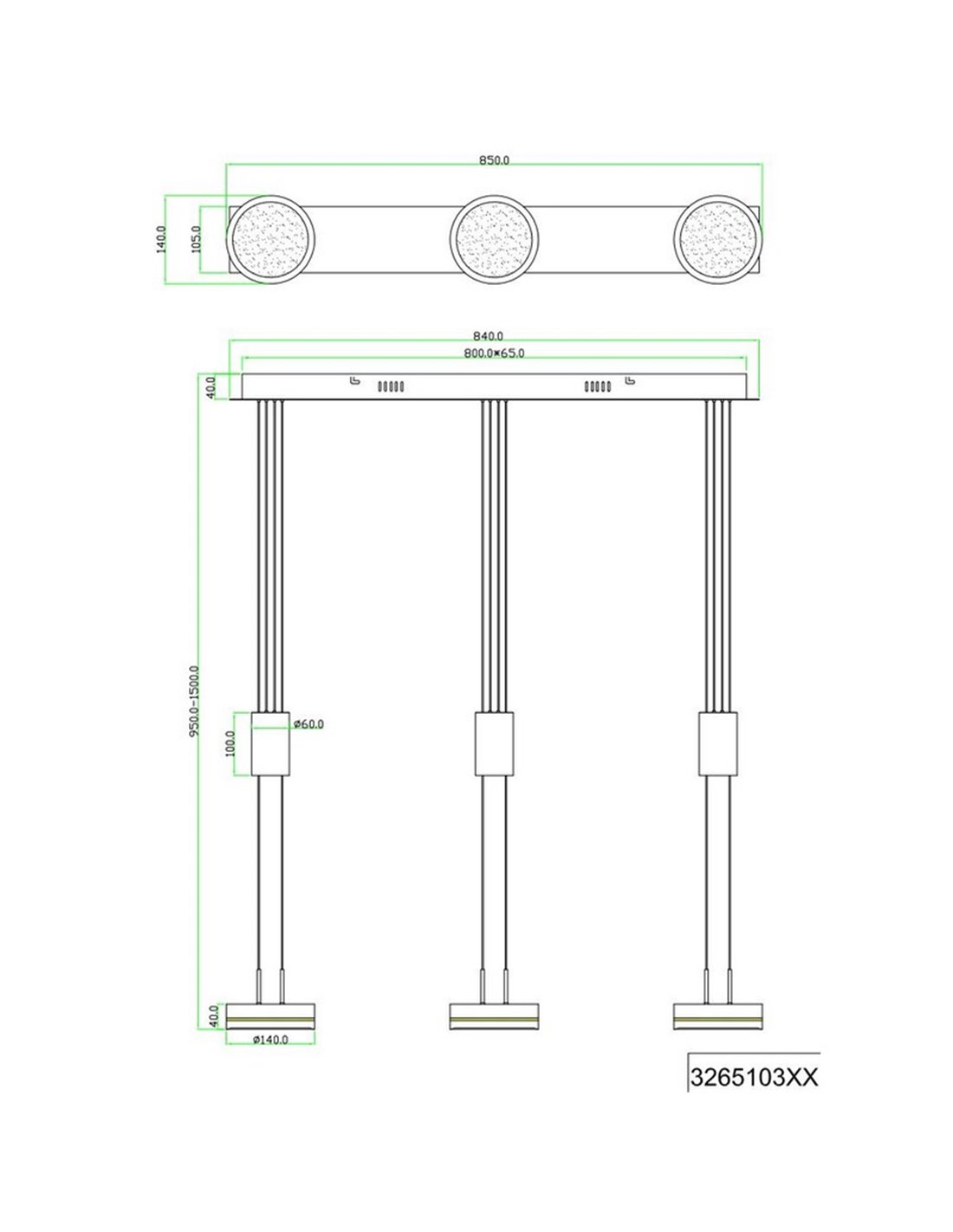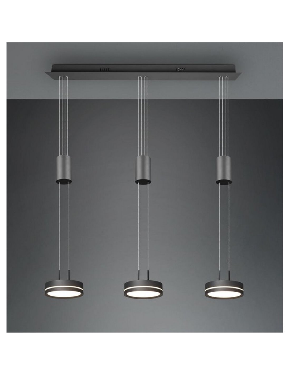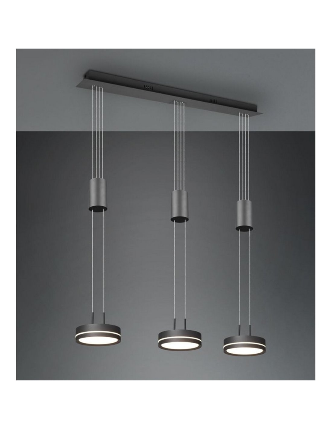 El cuerpo de aluminio en color antracita combina resistencia y estilo contemporáneo. Las tres luminarias suspendidas aportan un efecto visual equilibrado, perfecto para iluminar mesas alargadas o islas de cocina. Su estructura de 85 × 14 cm y altura regulable entre 95 y 150 cm permite una instalación personalizada según el espacio.