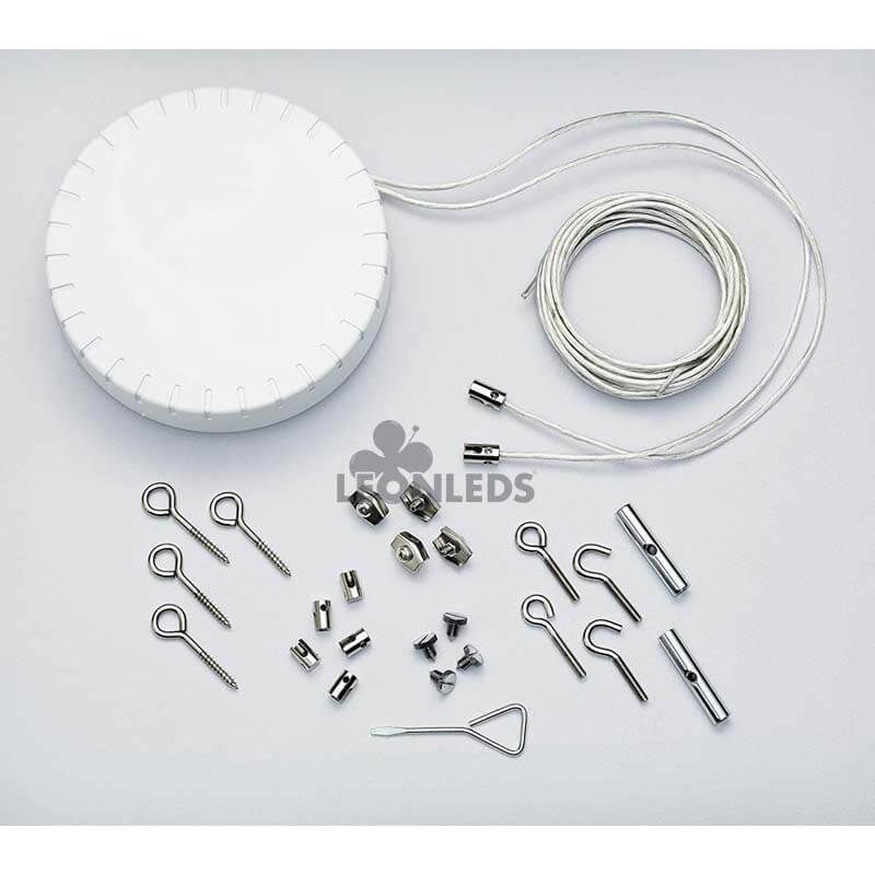 Los focos de esta lámpara se pinzan a los cables tensados que disponen de una lontigud máxima de 5 metros. Podemos instalar hasta 5 focos como máximo a lo largo de estos 10 metros de cable, que se cortan a la mitad para obtener 2 cables de 5 metros cada uno. Los focos son totalmente orientables.