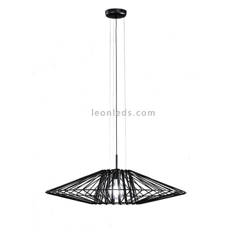 Su diseño original está fabricado con un cuerpo en forma de platillo con metal negro mate y trenzado con cuerda de 1 o 2 colores a elegir. Cuenta con 2 cables colgantes regulables y florón de color negro mate, de modo que podrás ajustar su altura en función de tus necesidades o dimensiones de la estancia. Es ideal para iluminar las barras o mostradores de establecimientos comerciales.