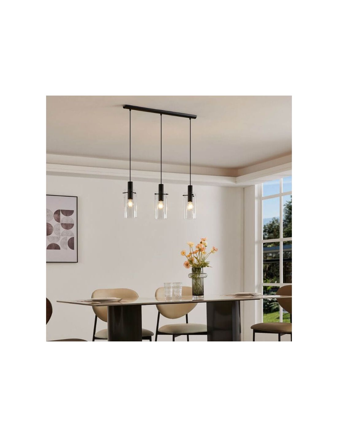 Lámpara de techo colgante con 3 pantallas de vidrio en forma de cilindro de la colección Montefino de Eglo Iluminación. Es una lámpara de estilo clásico y elegante perfecta para cualquier estancia que requiera iluminación y decoración a la vez con toques de vidrio y cristal. En sus pantallas predomina el cristal transparente con toques de acero negro. Necesita de 3 bombillas con casquillo E27 (no incluidas). Recomendamos el uso de unas bombillas LED de filamento tipo vela, tubulares o Edison para realzar su estilo retro ya que las mismas quedarán ligeramente visibles tras las 3 pantallas de cristal. Preferiblemente elegir un tono cálido como el 3.000k que potenciará ese efecto vintage o retro buscado. La potencia recomendable es de 10 a 17W en función de las dimensiones de la estancia que necesitemos iluminar.