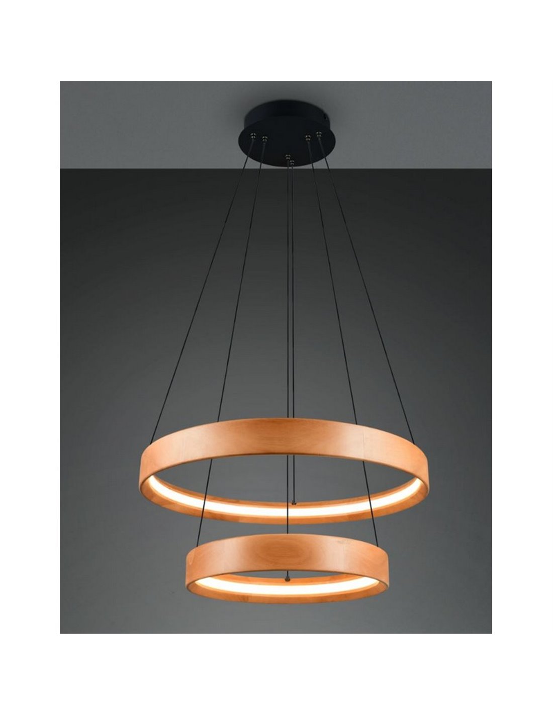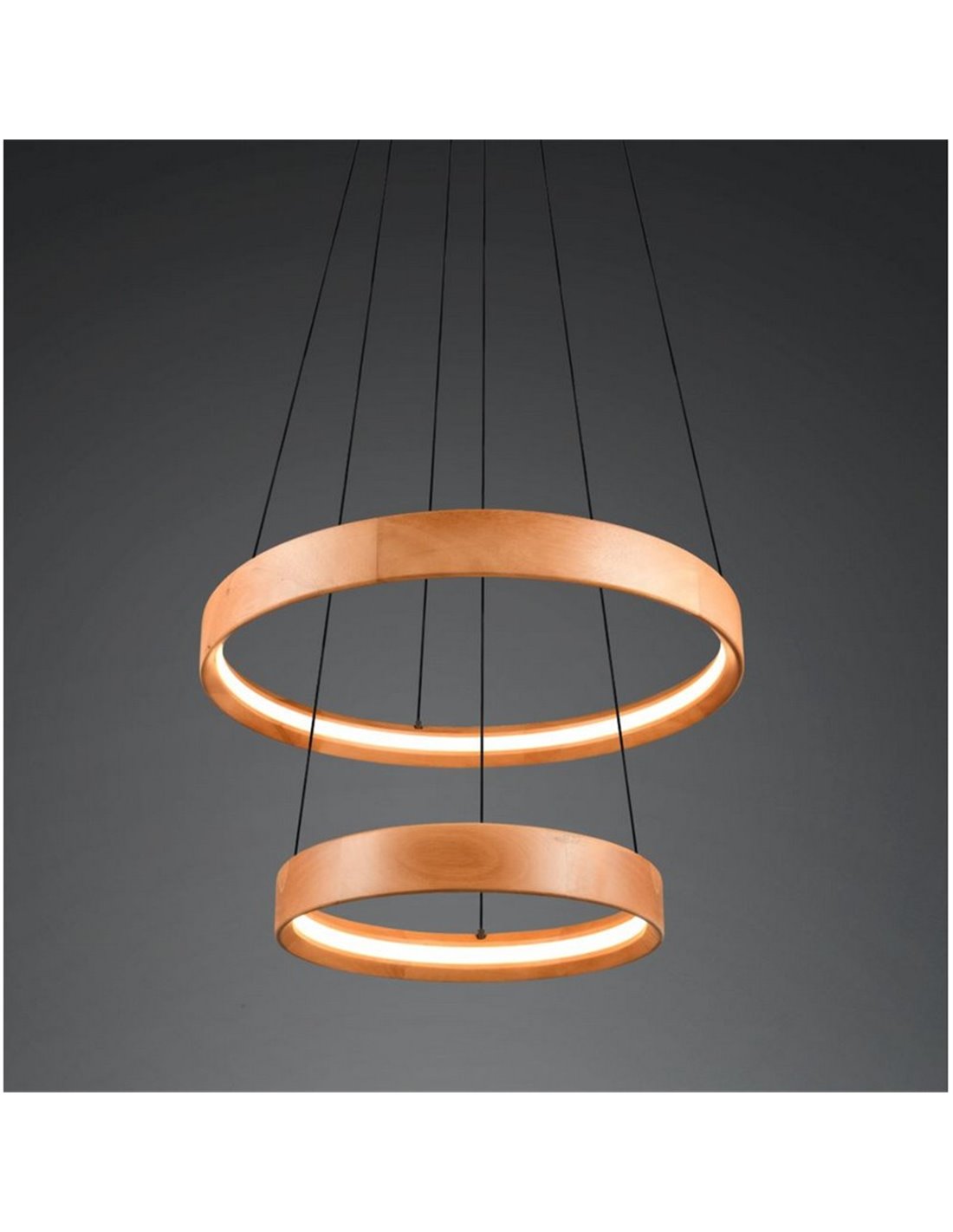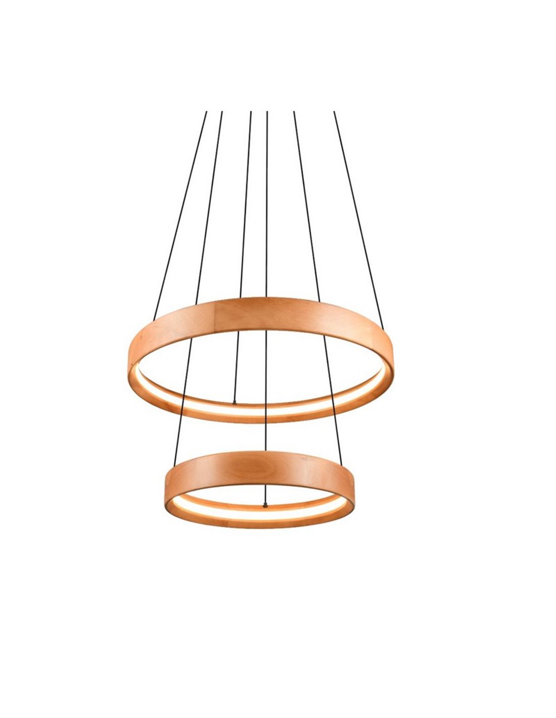 Lámpara de techo LED LYNWOOD de madera natural, con 2 luces, 37W de potencia y 4300 lúmenes. Ofrece luz cálida de 3000K, altura ajustable y regulación mediante interruptor. Un diseño moderno de 60cm de diámetro para interiores acogedores.