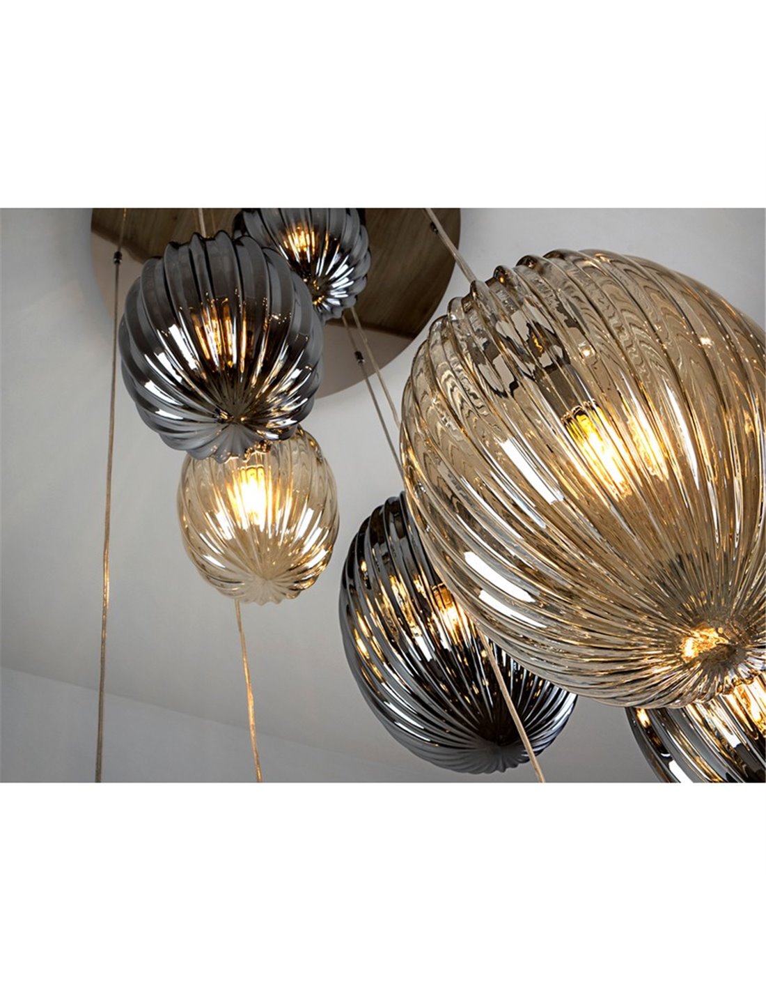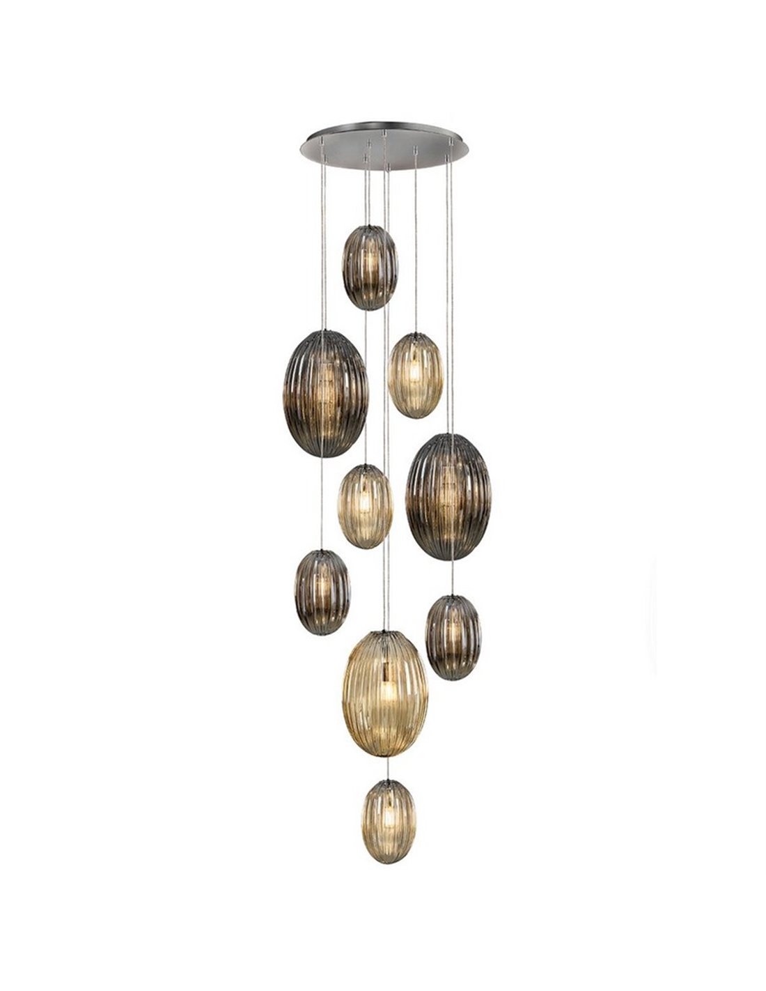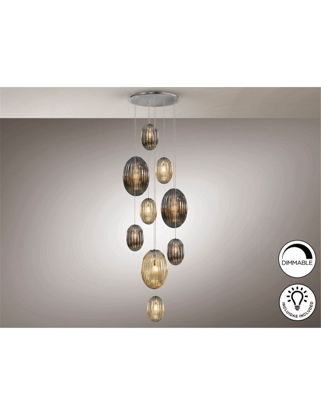 La OVILA es una lámpara de techo decorativa que destaca por su composición de 9 puntos de luz con tulipas de cristal en dos tonos distintos: coñac y gris smoke espejado. La combinación de tamaños y colores crea un efecto visual dinámico y elegante, ideal para espacios amplios.