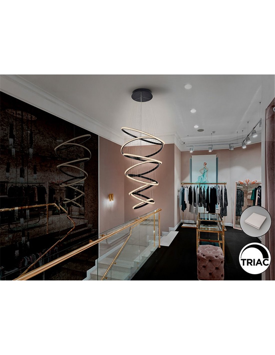 Integra LED de 162W con un flujo luminoso de 8.100 lúmenes y luz cálida 3000K, ideal para iluminar salones amplios, comedores o espacios de doble altura. Cada aro es regulable en altura, permitiendo personalizar la disposición visual de la lámpara.