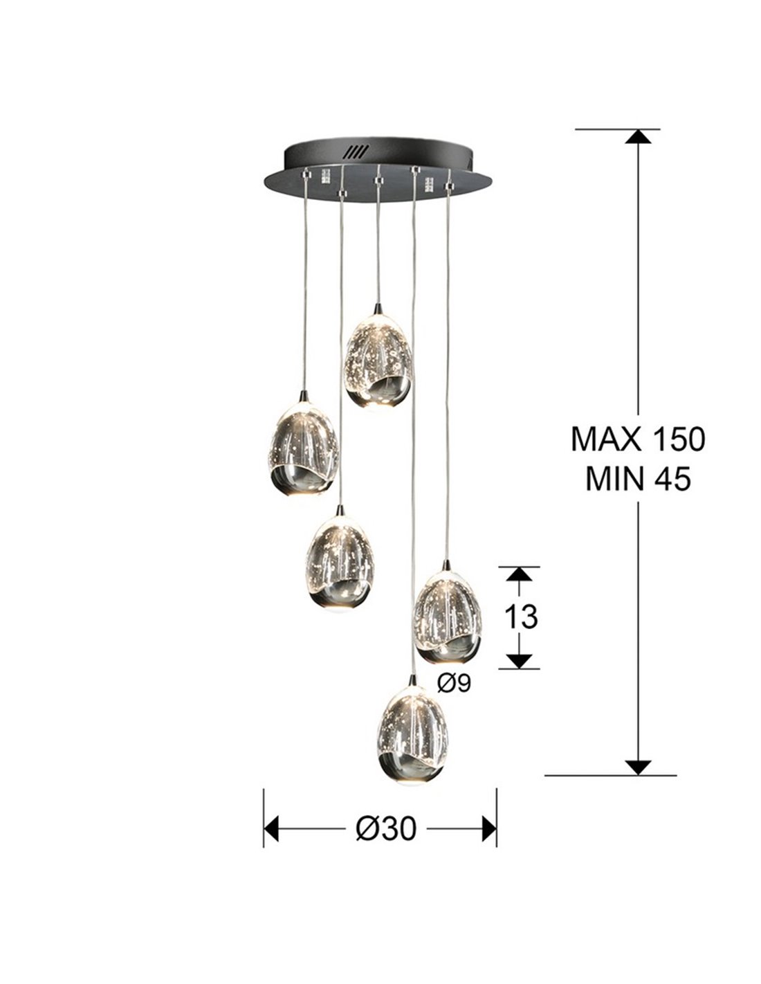 La ROCÍO es una lámpara de techo de diseño elegante y decorativo, compuesta por cinco tulipas en forma de gota fabricadas en cristal macizo transparente con burbujas interiores. Su estructura en metal acabado cromo aporta un estilo sofisticado y luminoso.