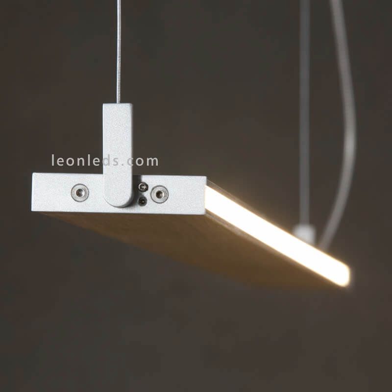 Su pantalla plana y alargada es de aluminio, madera y acrílico, lo que facilita su limpieza y mantenimiento. Su diseño en suspensión mediante cables de acero permiten a la lámpara colgar desde el techo, pudiendo regular la dirección de la luz, dotándola de versatilidad y generando un efecto flotante. Es una lámpara de techo colgante muy versátil que se integra fácilmente en el espacio con su estética original y sugerente.