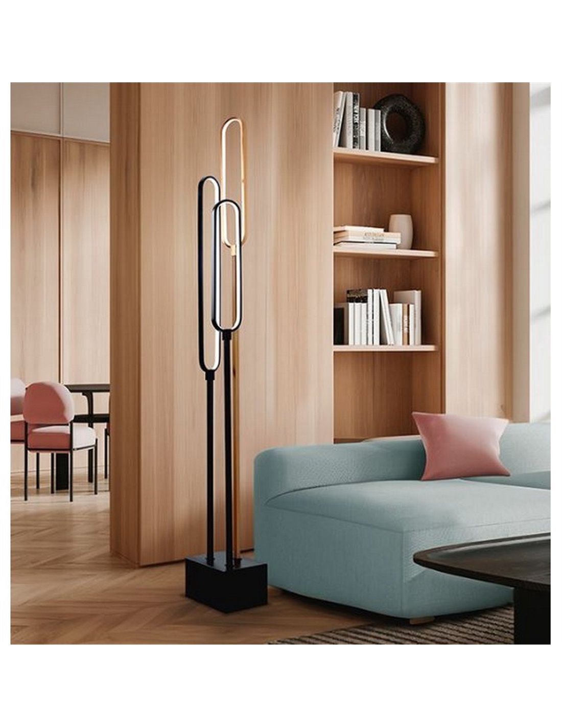 La COLETTE es una lámpara de pie diseñada para crear una iluminación decorativa y envolvente en cualquier estancia. Sus tres líneas de luz en disposición vertical generan un efecto elegante y moderno, mientras que la combinación de oro rosa y negro mate aporta un toque sofisticado que destaca en salones, dormitorios o espacios abiertos.