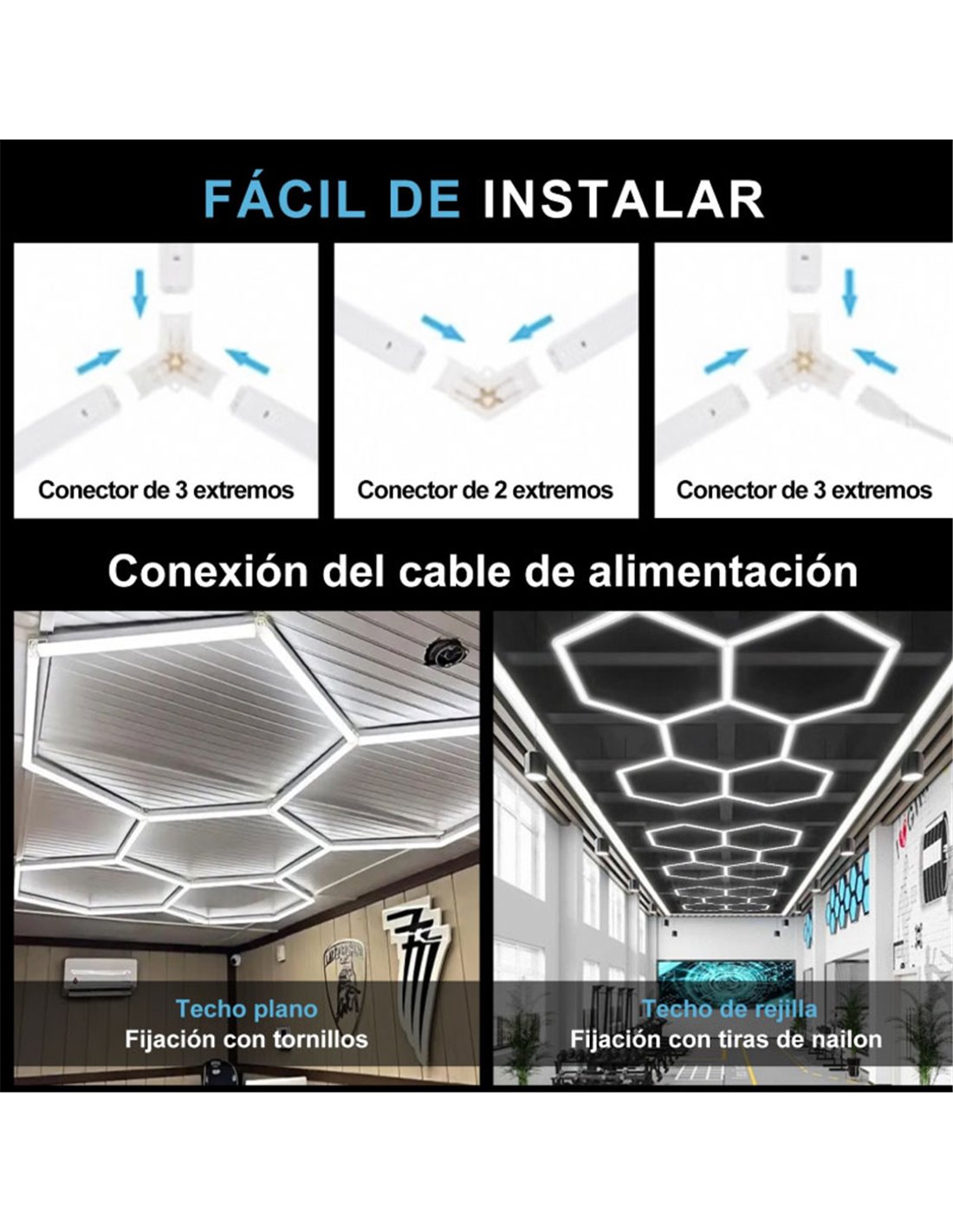 La lámpara LED hexagonal de 5 paneles es perfecta para crear un techo moderno en talleres, garajes, gimnasios y estudios. Con una potencia de 144W, luz fría 6500K y unas dimensiones aproximadas de 2220x1550mm, este panel LED hexagonal blanco proporciona una iluminación uniforme y muy llamativa que realza vehículos, productos y zonas de trabajo en interiores secos (IP20).