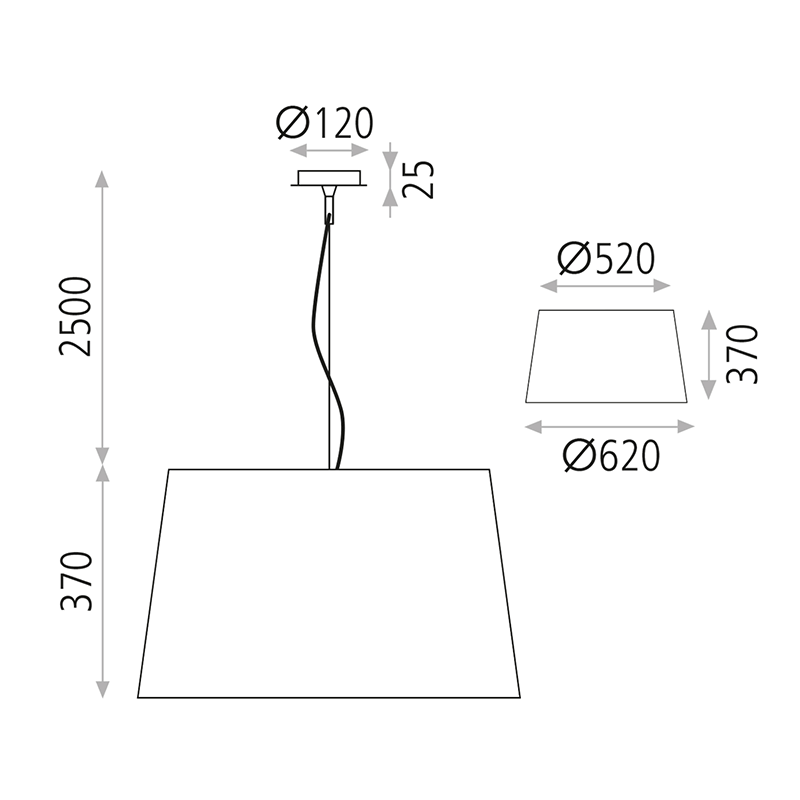 Gracias a su cable tensor, esta lámpara consigue una longitud máxima de 2,5 metros que, sumando los 37 centímetros de altura de la campana, hace que la lámpara consiga una altura total de 2,87 metros.