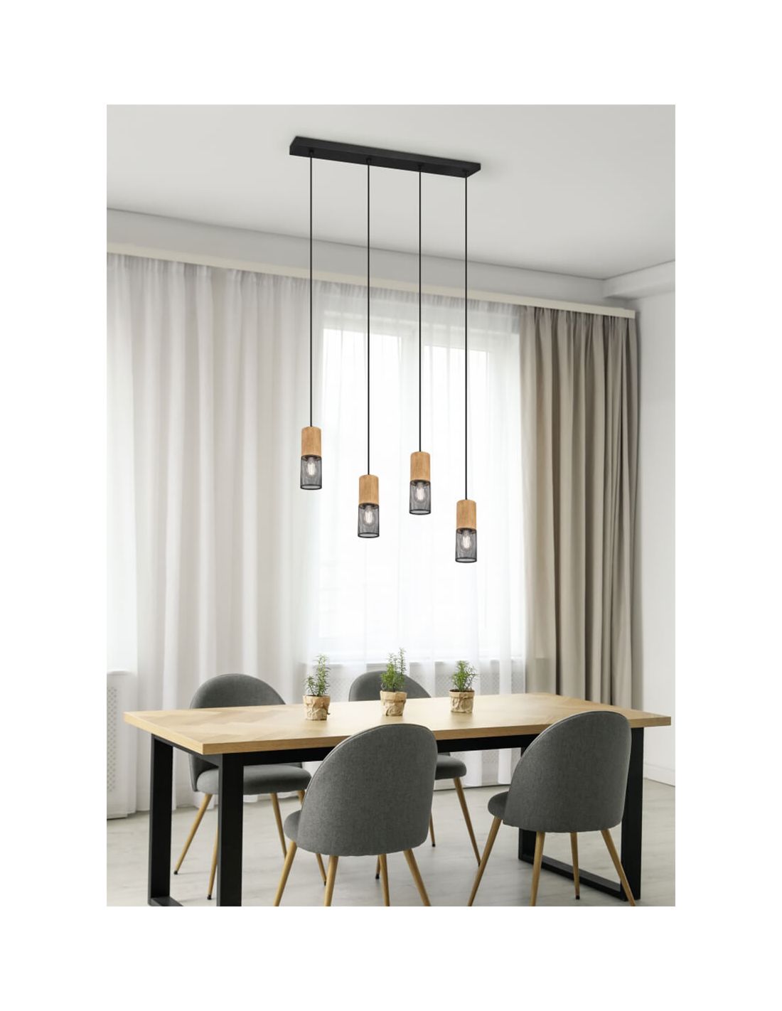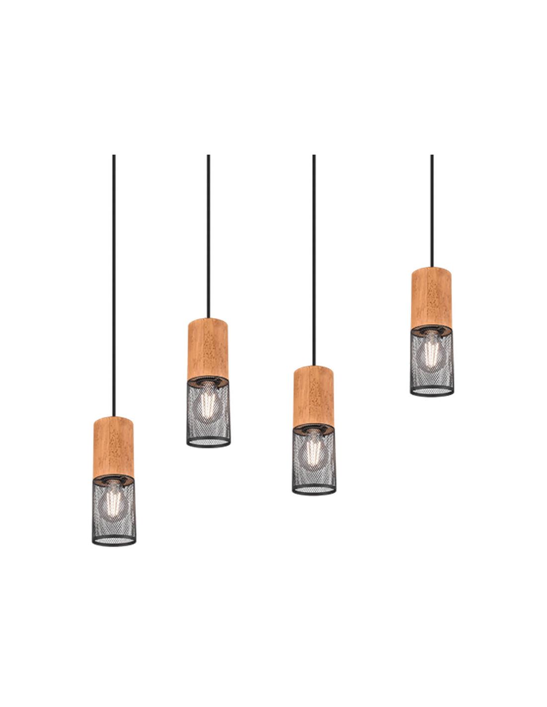 Lámpara de techo rectangular con 4 focos colgantes de la colección Tosh de Trio Lighting. Cuenta con 4 focos colgantes con pantallas metálicas negras en formato red y cuatro bases de madera que se conectan a cuatro cables negros. Estos cables se conectan a una base metálica que se instala en el techo. Necesita de la instalación de 4 bombillas E27 (no incluidas) con un máximo de 40W. Podrás elegir el tono de luz que prefieras en función de la estancia y su tamaño. Desde LeónLeds te recomendamos la instalación de bombillas de estilo vintage con filamento visible para potenciar su estilo retro industrial.