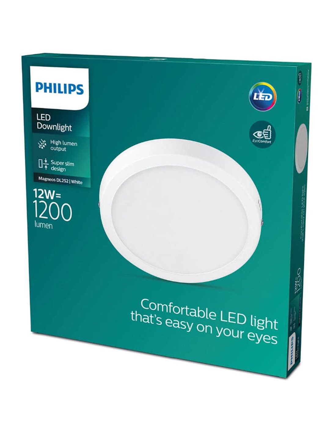 El Plafón de Techo MAGNEOS 12W de Philips, con un diámetro de 21 cm, está disponible en color blanco y ofrece opciones de temperatura de color de 2700K (luz cálida) con un flujo luminoso de 1200 lúmenes, y 4000K (luz neutra) con 1350 lúmenes. Su diseño ultradelgado y elegante lo hace ideal para diversas estancias del hogar.