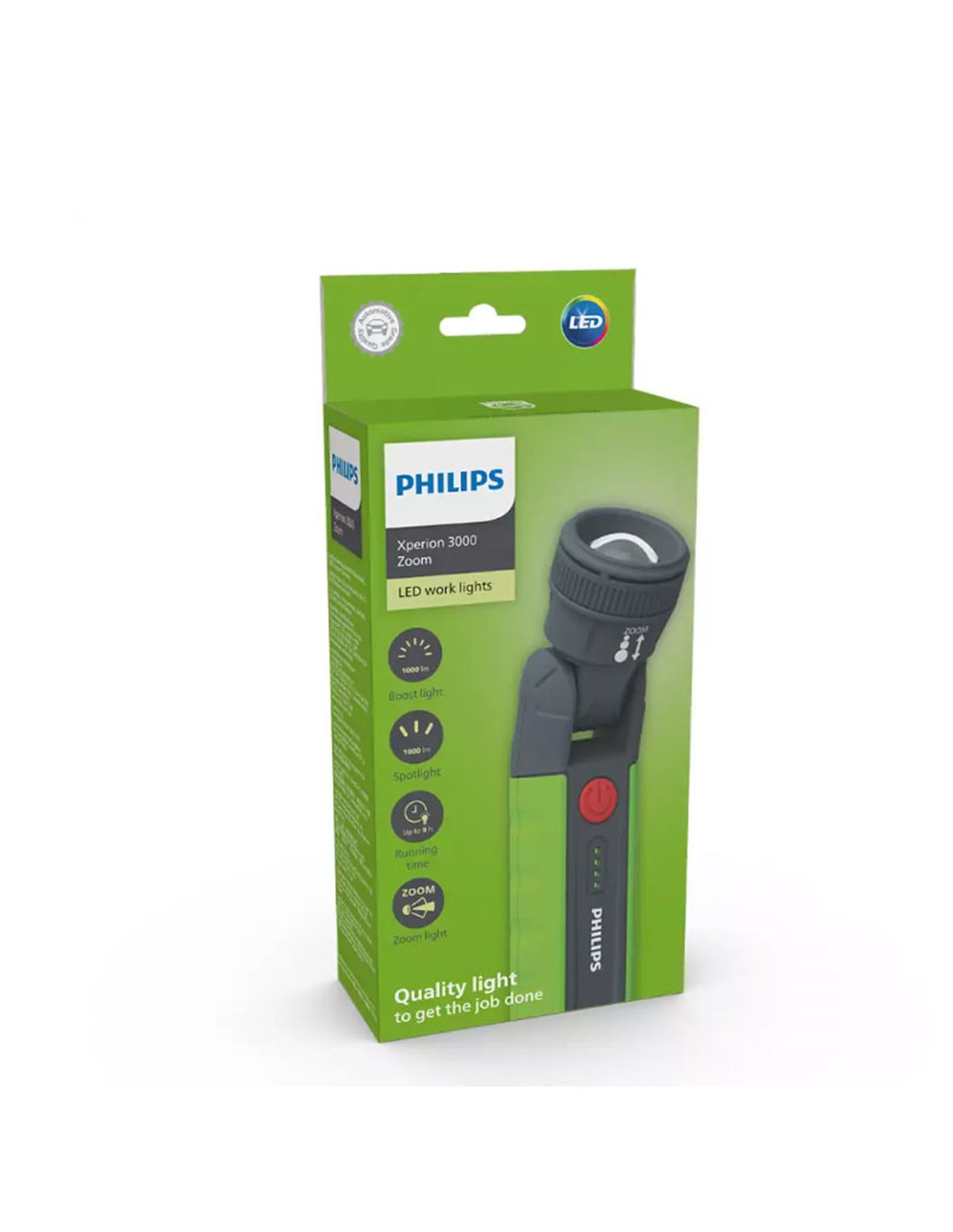 La linterna Xperion 3000 Zoom ofrece una iluminación potente y precisa. Con un diseño tipo mango antideslizante, proporciona 1000 lúmenes y una temperatura de color de 6000K. Incluye imán y cabezal pivotante de 180º para mayor versatilidad.
