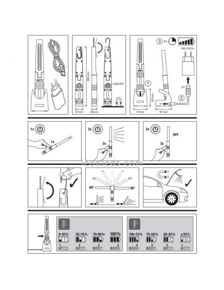 Incluye Linterna, base de carga, cable USB, enchufe USB 220v y libro de instrucciones.