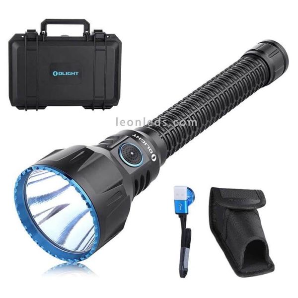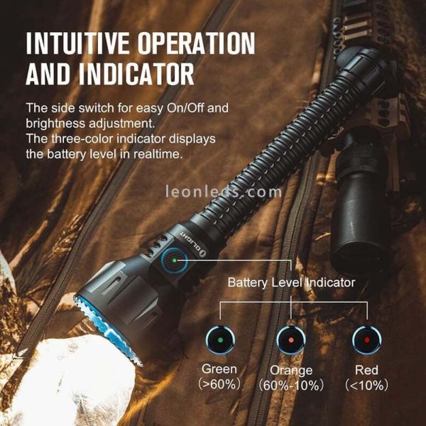 Cuenta con un haz de luz que alcanza hasta los 1300 metros y tiene una potencia de 1300 lúmenes y una duración de la batería de 318 horas. Incluye 2 baterías recargables 21700 de 3,6 V, 5000 mAh e interruptor trasero 3 en 1. Se puede cargar a través de un cable MCC3. Garantía de 5 años y resistencia al agua IPX8.