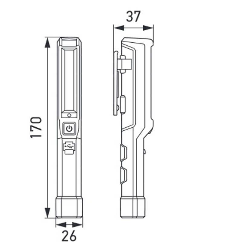 La Linterna LED tipo Boligrafo UPL150 incluye luz Frontal y luz Superior (3W COB - 1W) cuenta con Clip que gira 90º para poder orientar la luz a la zona deseada, resistente a impactos y muy ligera, tan solo pesa 60 gramos. Incluye cable de Carga Micro-USB y su batería Li-ion incluida es de 3,7V y 800mAh. Tiene las siguientes dimensiones: una altura de 17 cm, una longitud de 2,6 cm, una anchura de 3,7 cm con un peso con pilas de 60g. Su duración de batería es de 3 Horas en la luz principal y 4 Horas en la superior, su tiempo de carga es de 1,5 Horas.