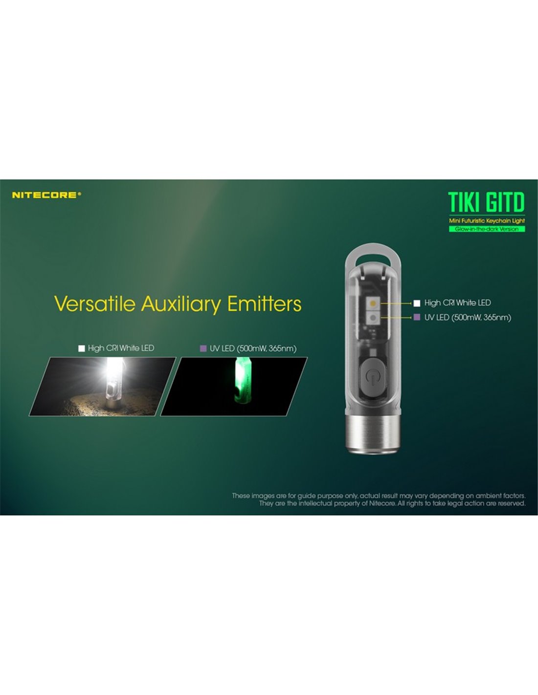 La Linterna LED TIKI GITD GREEN es una linterna de mano ultra ligera que se destaca por su diseño compacto y funcionalidad avanzada. Con un potente LED OSRAM P8 que alcanza hasta 300 lúmenes y un alcance de 71 metros, es ideal para situaciones que requieren una luz brillante y de bajo peso.