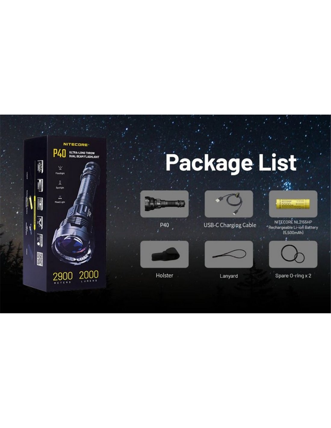 La Nitecore P40 es una linterna táctica profesional diseñada para ofrecer el máximo rendimiento en situaciones exigentes. Con un doble sistema de haz (reflector floodlight y lente LEP spotlight), alcanza una potencia de 2.000 lúmenes y una distancia máxima de 2.900 metros, lo que la convierte en una de las linternas de largo alcance más potentes de Nitecore.