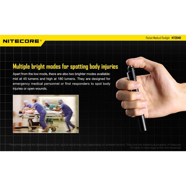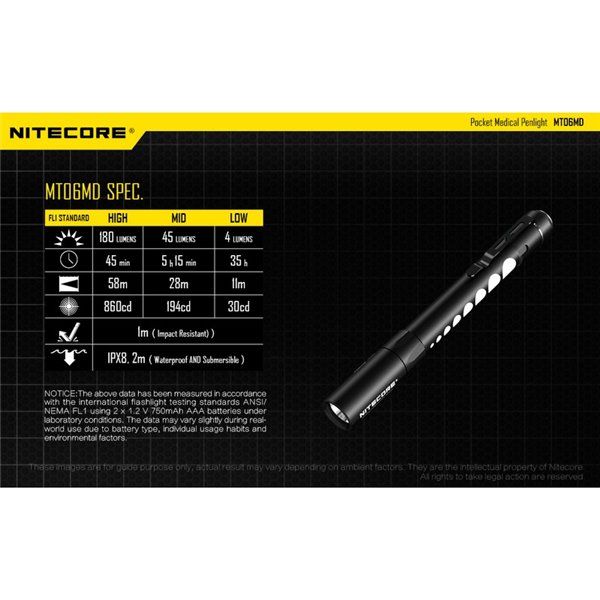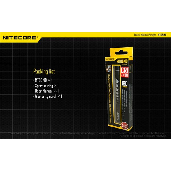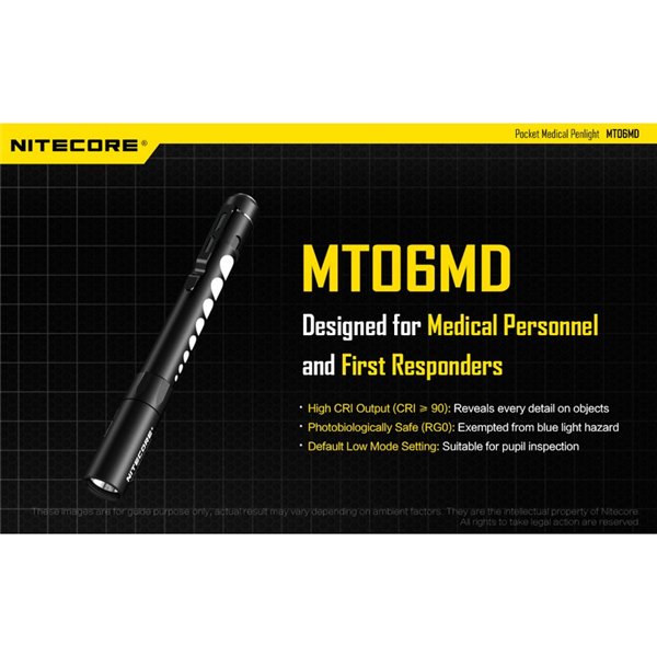 La MT06MD es una linterna compacta y ligera, diseñada para brindar una iluminación precisa y segura en cualquier entorno médico. ¡Obtén la tuya ahora y mejora tus herramientas de inspección con la calidad de NITECORE!